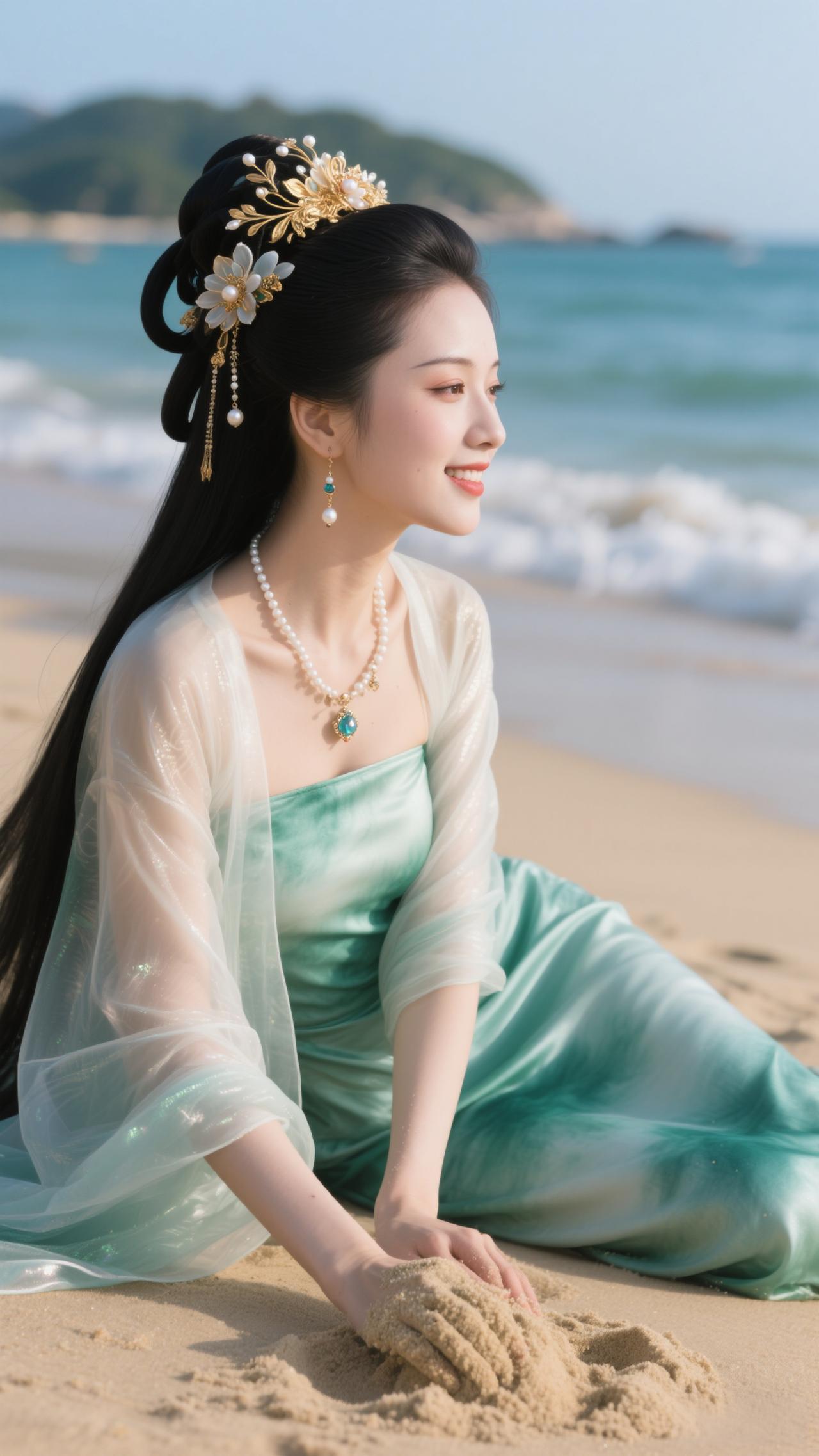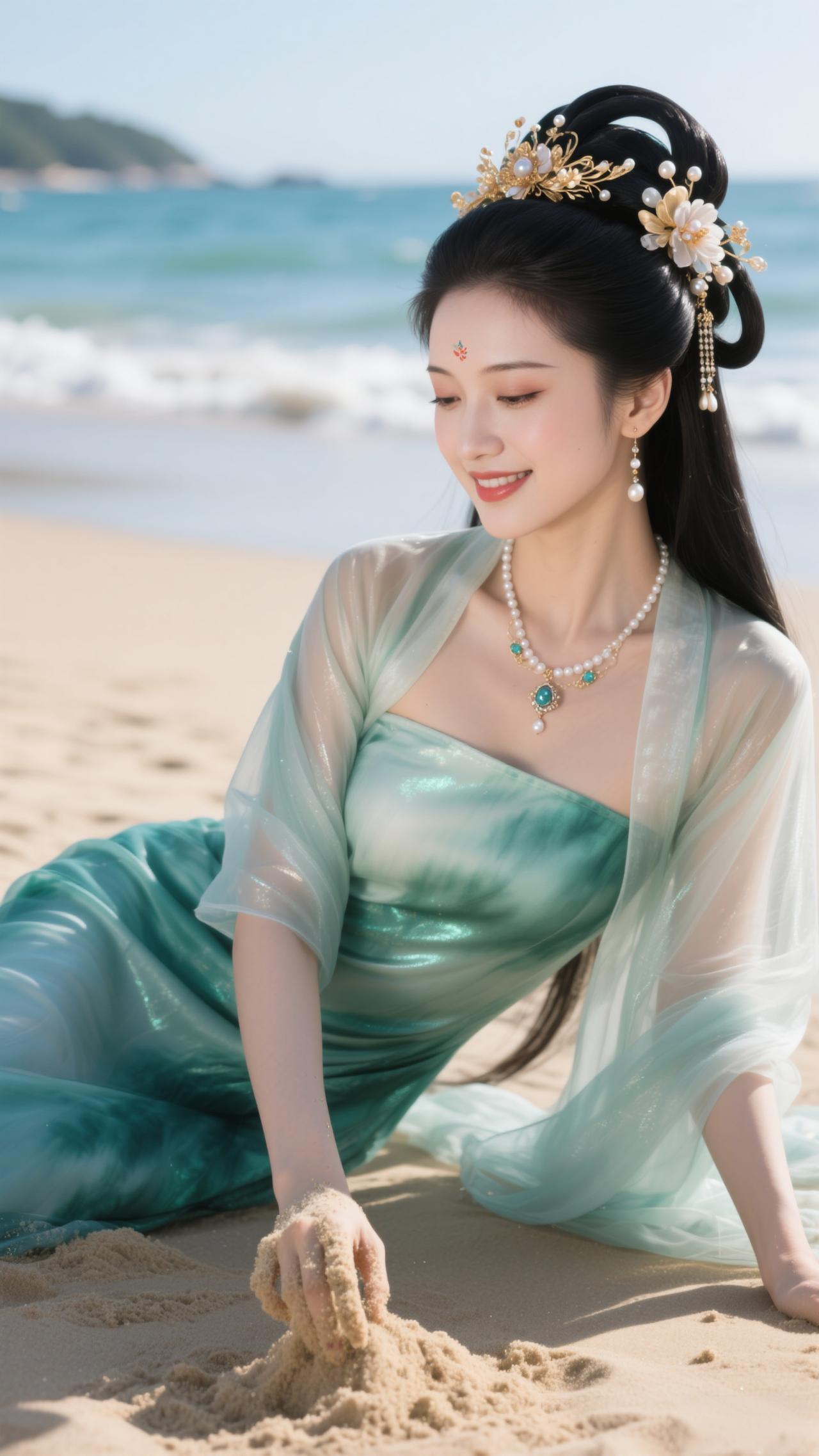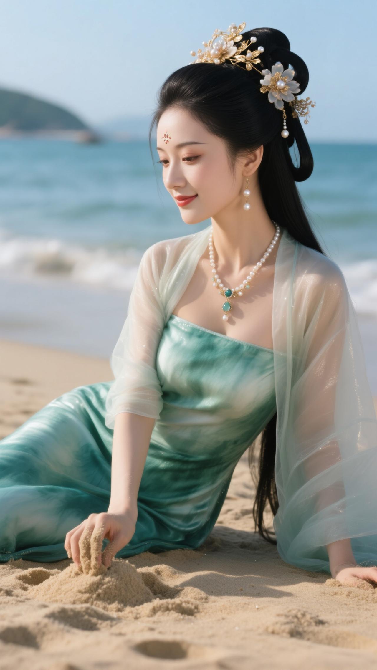 碧海漾清辉,沙岸凝翠影,佳人着青绫罗裙卧于银滩,金簪垂珠摇落海风,青丝漫卷如墨浪。指尖轻触细沙,眉眼间漾着山海的温柔,恍若深海走出的鲛姬,将碧波揉作衣袂,把潮声藏进鬓边。