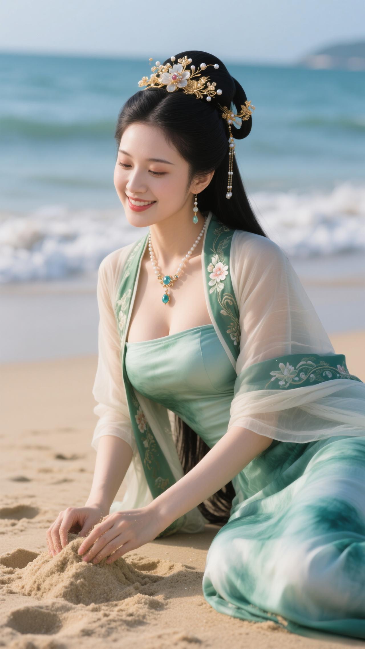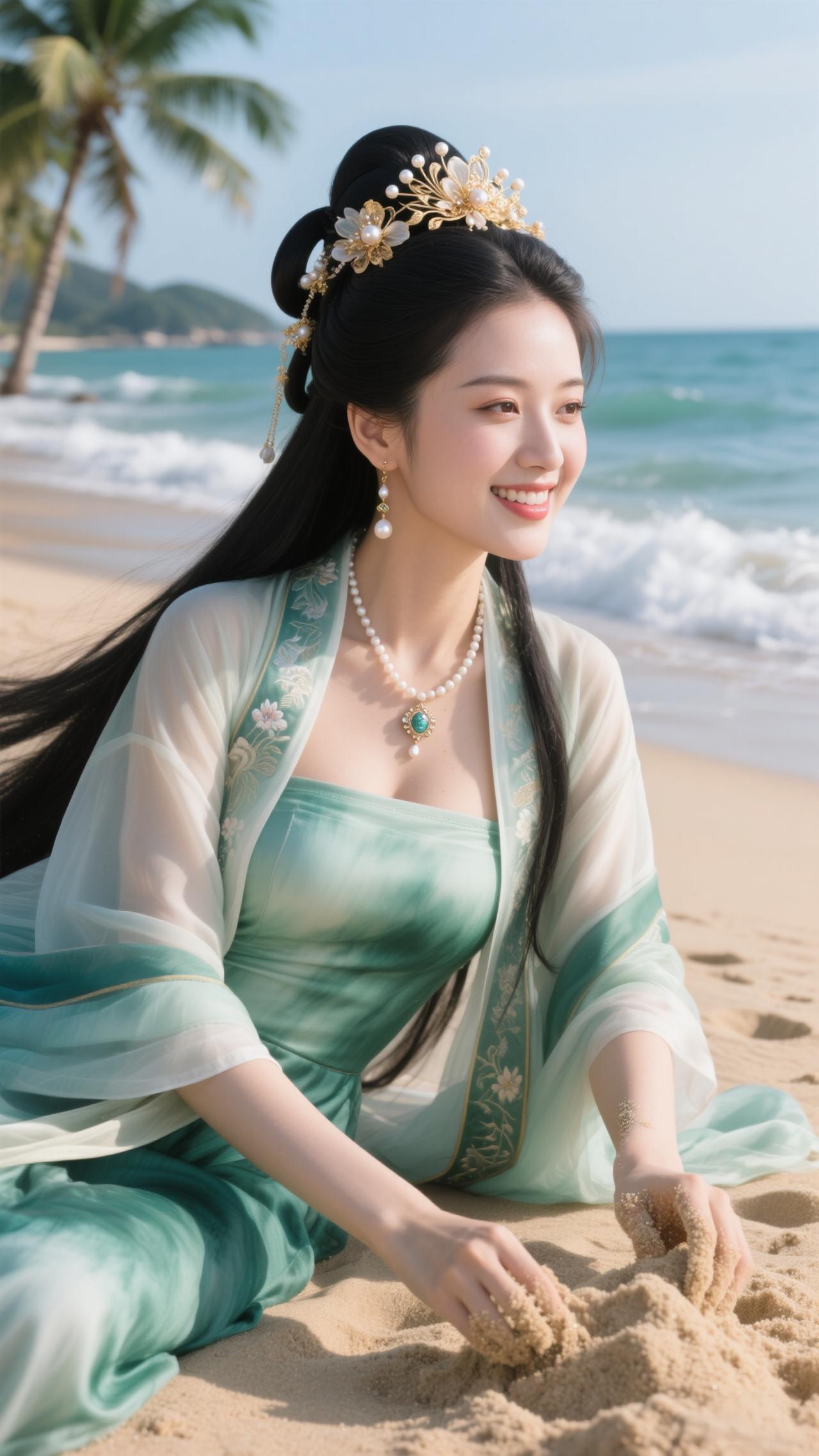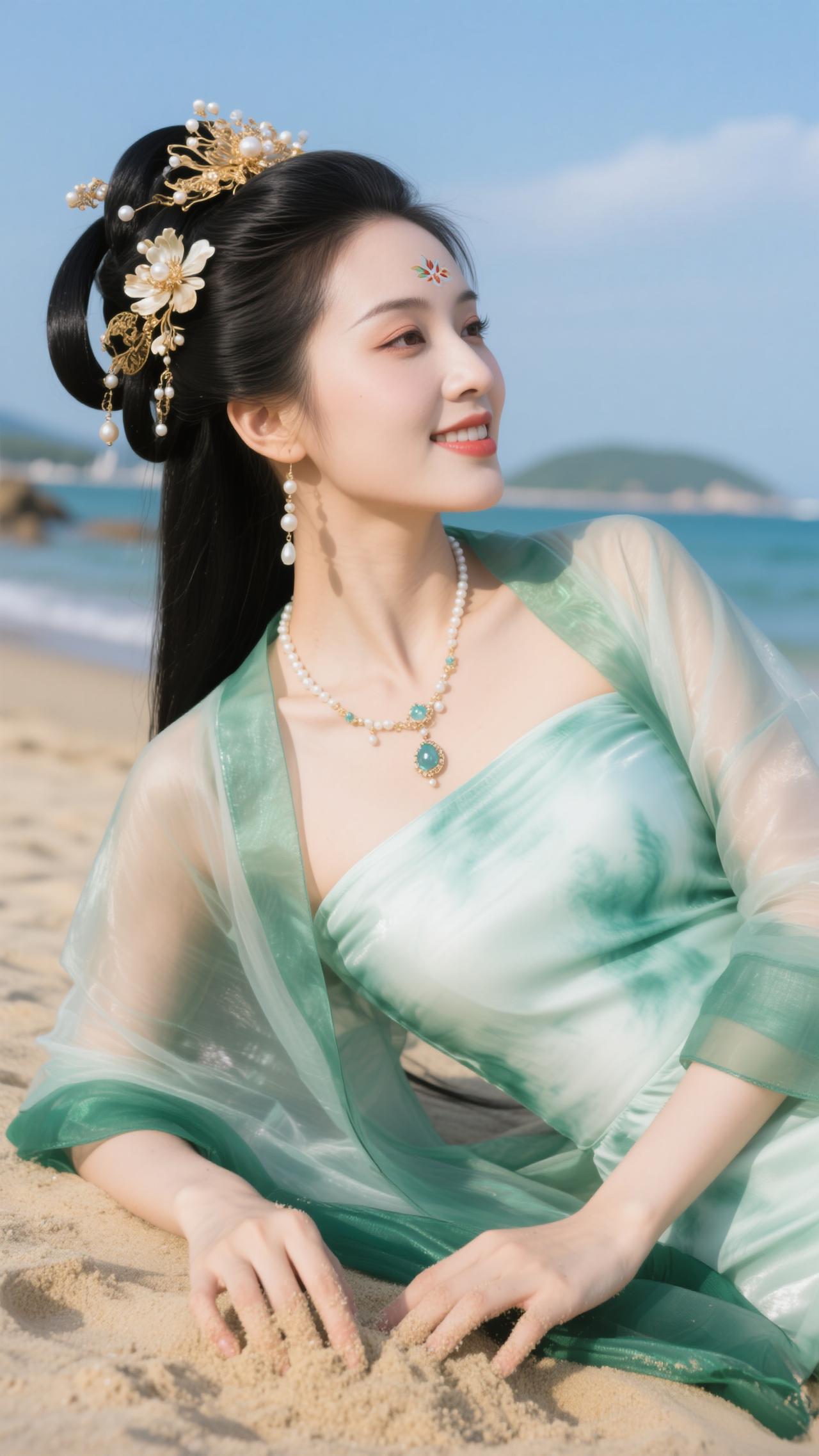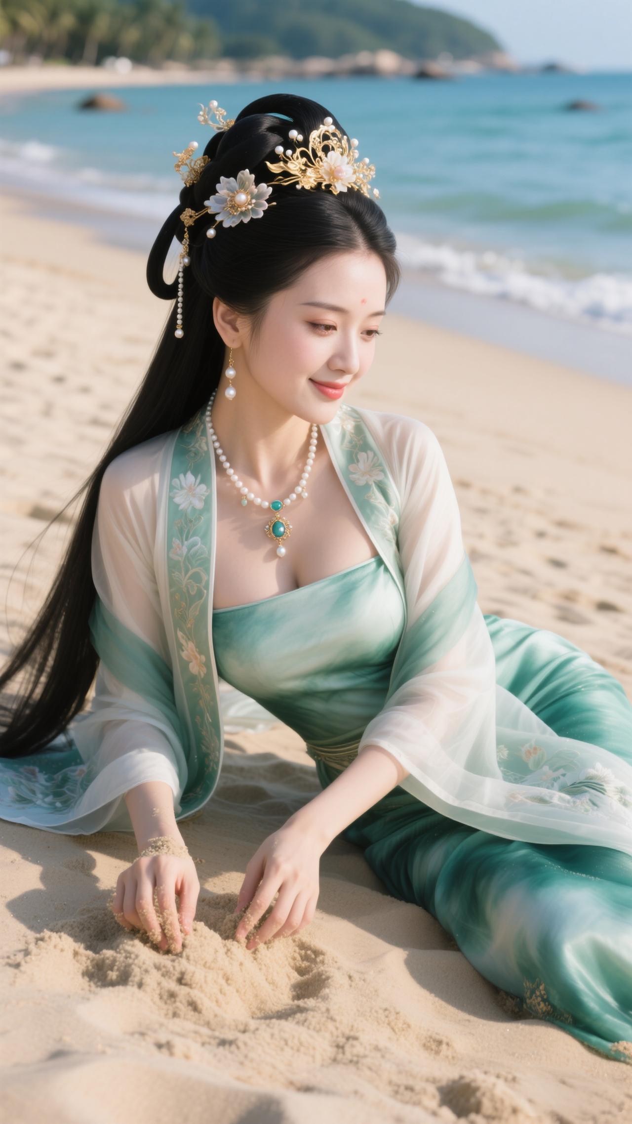 碧海漾清辉,沙岸凝翠影,佳人着青绫罗裙卧于银滩,金簪垂珠摇落海风,青丝漫卷如墨浪。指尖轻触细沙,眉眼间漾着山海的温柔,恍若深海走出的鲛姬,将碧波揉作衣袂,把潮声藏进鬓边。