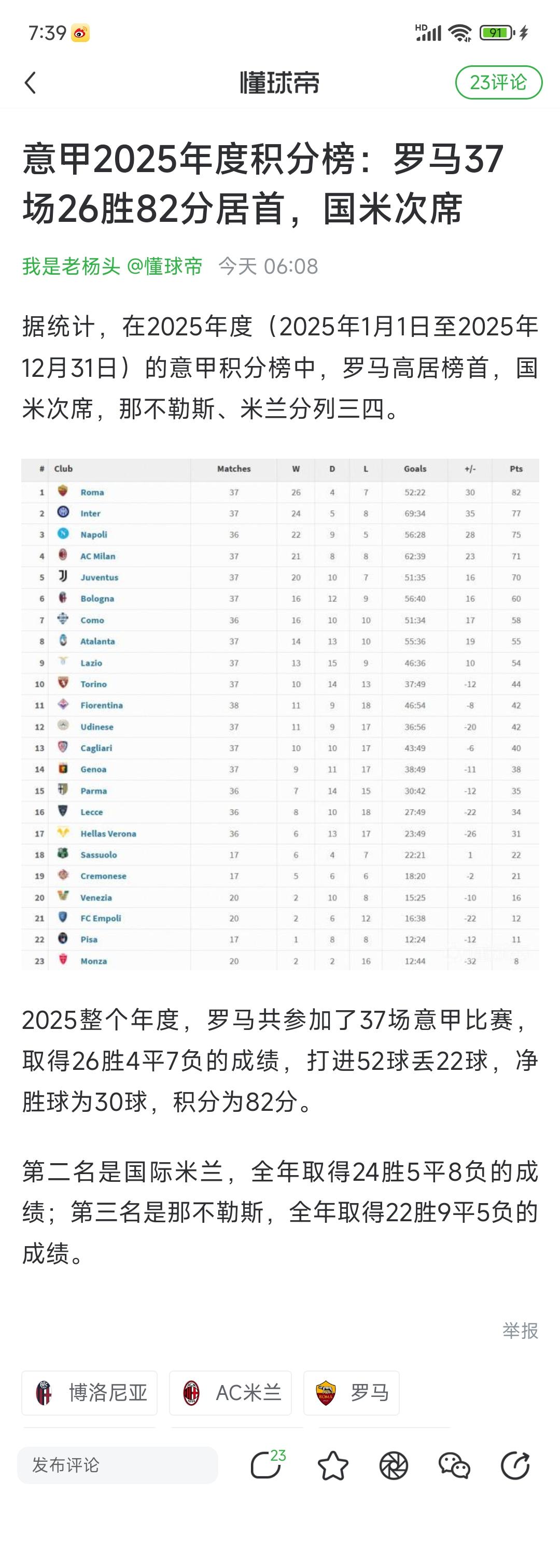 罗马是2025年意甲总积分第一! 没有意甲冠军就算了,再没有欧冠席位多可惜。 国际米兰总积分第二,没有冠军。 那不勒斯还是厉害,总积分第三,意甲冠军![赞]