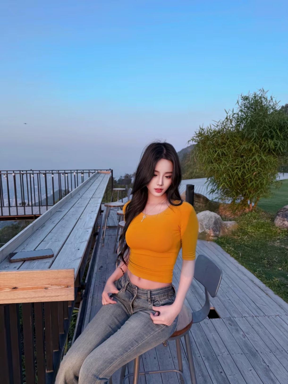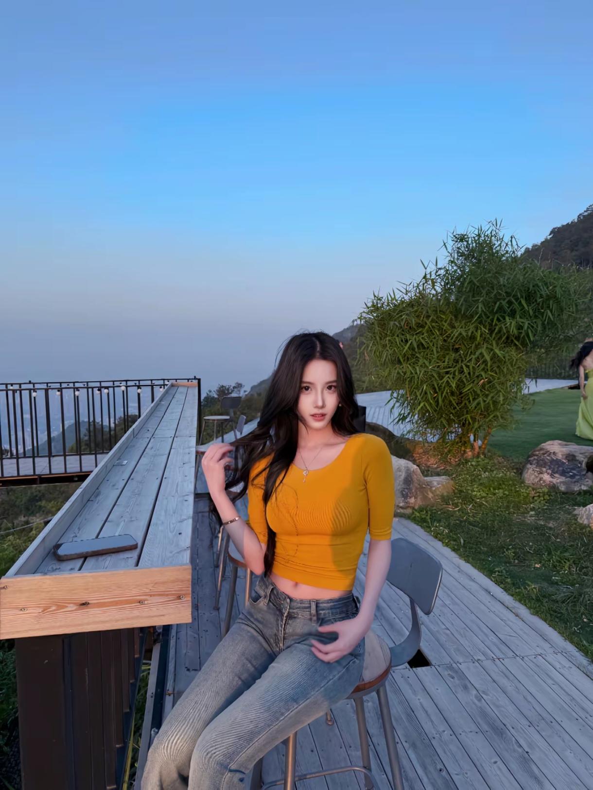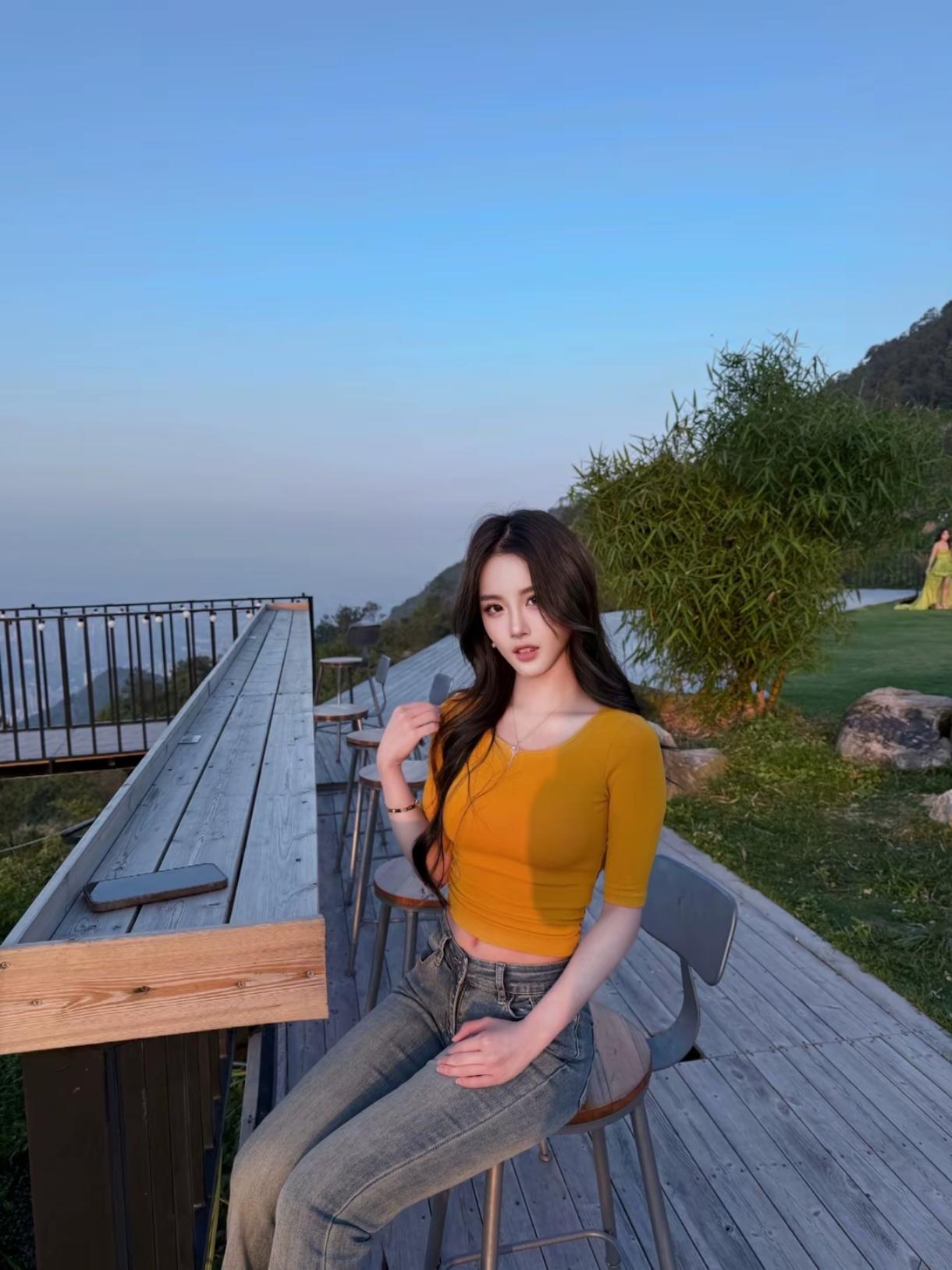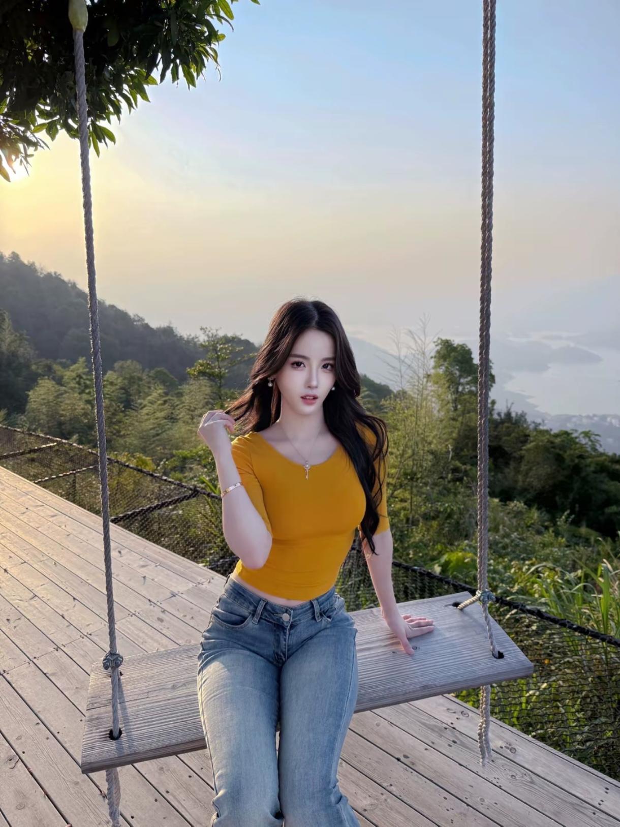 临江仙·山间暮色逢娇影 远岫叠青凝暮色,晴光漫染层林。木台秋千系云深,橘衣裁夏色,纤手弄绳襟。 竹影摇风依石径,晚天渐换蓝襟。玻璃窗畔绿阴沉,鬓丝随晚吹,一笑动山心。 登这山间露台时,恰见斜阳吻过峰峦,金辉淌在木质栈道上,秋千悠悠悬在风里。她着姜黄短衫配牛仔长裤,倚着秋千板的模样,像把半盏晚霞揉进了衣衫,远山如黛作了背景,倒衬得身影愈发鲜活。 待暮色渐浓,天色浮起浅蓝,她坐于木台的高脚凳上,指尖轻拨发梢,竹影在身侧婆娑摇曳。玻璃房内的绿植映着窗外的暮色,晚风掠过发梢的弧度,让满山清宁都多了几分软意。 山间黄昏本是清寂的,因这一抹橘色明媚,便成了最生动的风景。她抬手低眉的瞬间,山野里的风都似放缓了脚步,轻拥着这片刻的温柔,连远处的云影,都似停在天边,舍不得打破这画面。