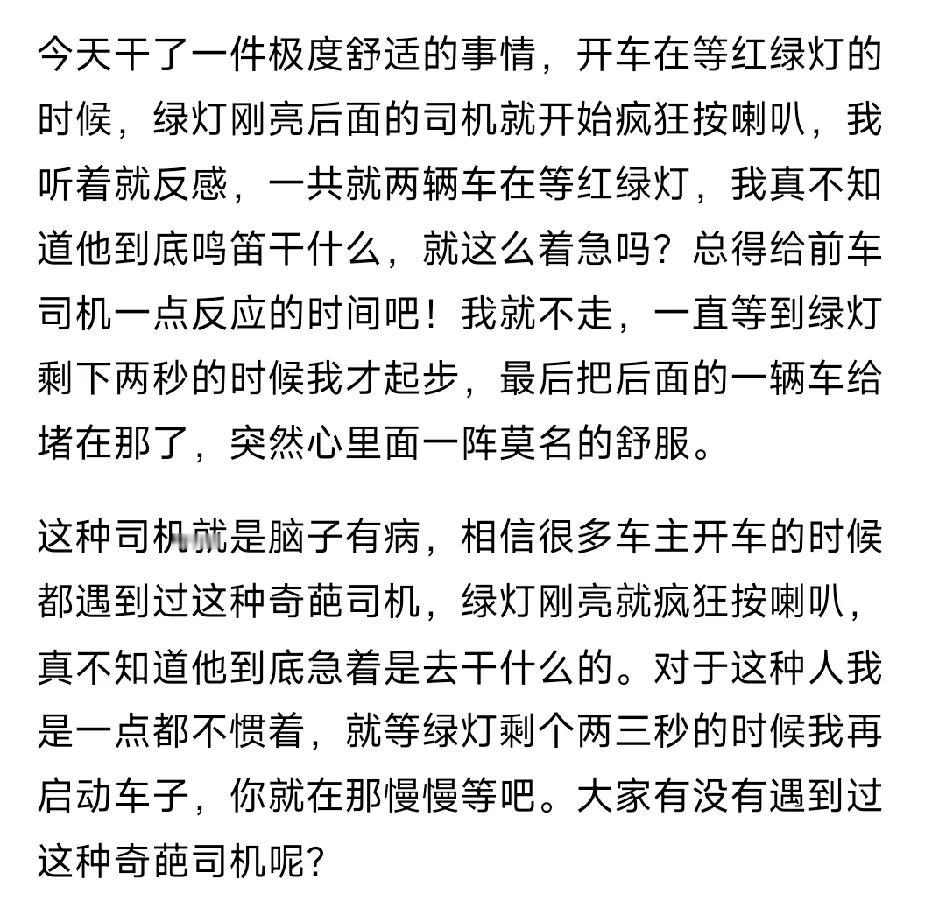 这世上最大的恶莫过于在自己权限范围内最大程度地为难别人。有一次我开电三轮路过一个路口,那条路单向双机动车道,路边留下只有一米左右的非机动车道,最右侧车道内连续几辆大货车等红灯,非机动车道边上还有一个照明灯杆,我就在大车右后面等,后边又来一电三轮一直鸣喇叭,还埋怨我为啥不走,我说是想让你先走呢,你走吧,看能过去不能,他顿时没有了嚣张气焰。 如果作为头一辆等侯红绿灯的车辆超过两三秒还不走的话肯定是你不专心或者是慢性子!后车是有急事或者急性子,你走就是了,没必要这样的!如果遇到路怒症的人就得不偿失了,逞一时之快有时侯得负出大代价的。别无所谓的,这样的事引发的事件还是不少的,退一步海阔天空。 在路上开车偶尔能遇到这样的司机,可能人家有急事吧。如果绿灯刚亮后车就鸣喇叭,说明后车素质太低。但故意堵后车可能会受到其他司机的误解和指责。当然,开车在路上,的确是偶尔能遇到这样的奇葩之司机,可能是这种人的家里有大事着急吧?但是遇到这样的人选择堵后车,会让自己陷入负面情绪循环,得不偿失。太善良是一种病 凡事总让人三分 都不要太自私 何苦要委屈自己 为人别太过分 无善意纯恶意 何苦为难每一天