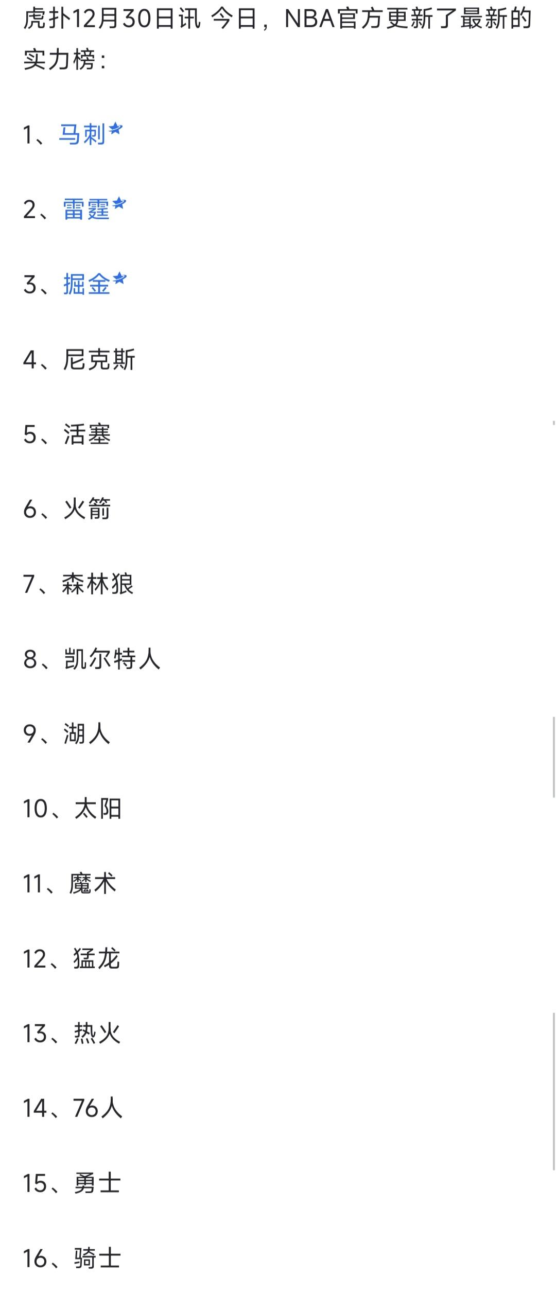 NBA这么快就改朝换代了! 本来雷霆有机会冲击74胜,没想到连续被马刺击败,现在马刺是势力榜第一。 雷霆刚注备建立王朝呢。 尼克斯在NBA杯决赛击败马刺,三足鼎立了!。 另外掘金不容小觑,约基奇是MVP榜第一。 湖人还能保住前十,不容易。[6]