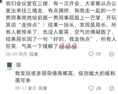 和我走一起的一个男同事突然给前面一男同事屁股上一巴掌,开玩笑说"走快点"!结果一抬头,发现是局长,所有人都惊呆了,也没人敢笑,空气仿佛凝固了,结果局长回了一句"好的,我走快点",所有人狂笑,气氛一下缓解了
