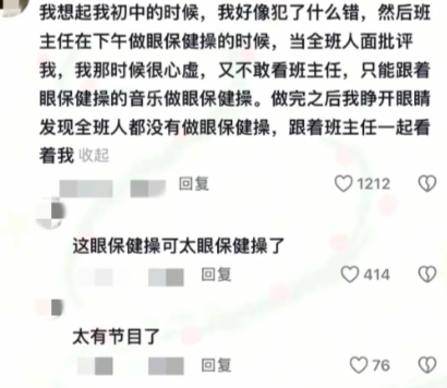 班主任在下午做眼保健操的时候,当全班人面批评我,我那时候很心虚,又不敢看班主任,只能跟着眼保健操的音乐做眼保健操。做完之后我睁开眼睛,发现全班人都没有做眼保健操,跟着班主任一起看着我