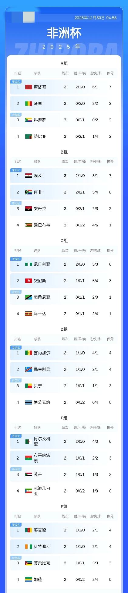 非洲杯A组积分榜:摩洛哥2胜1平积7分锁定第一,马里积3分第二出线 12月30日 非洲杯小组赛A组比赛全部结束,摩洛哥积7分第一,马里积3分排第二,两队晋级淘汰赛。 科摩罗积2分,因净胜球劣势已确定和赞比亚双双出局。 根据规则,非洲杯小组前两名直接晋级,所有小组中成绩最好的四个小组第三也可晋级16强