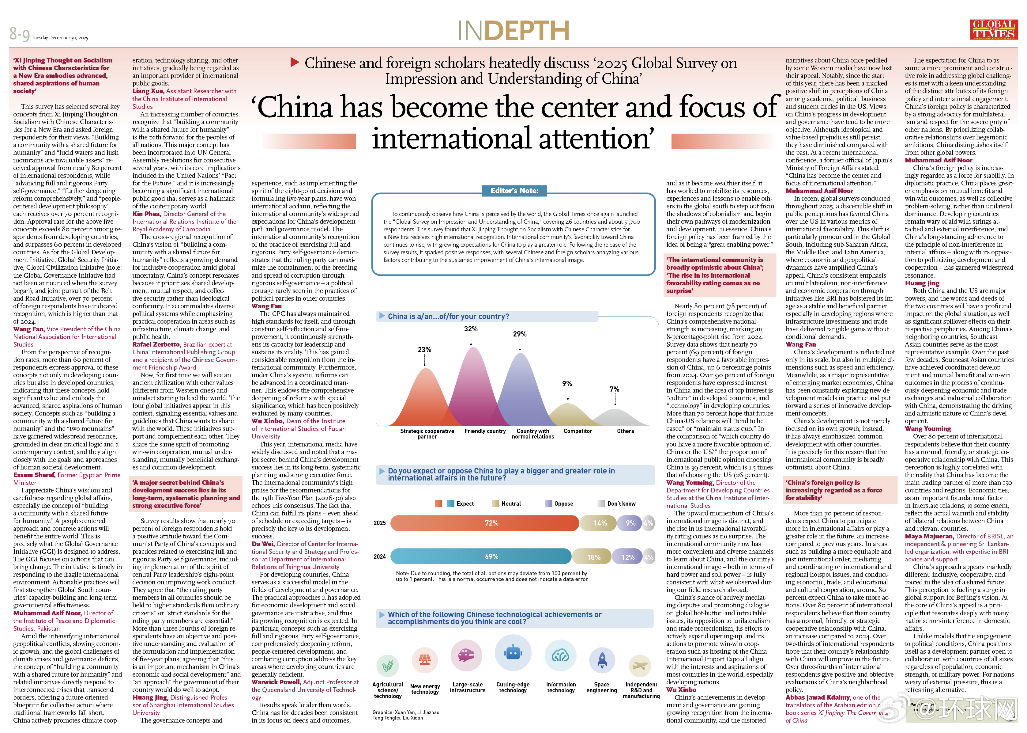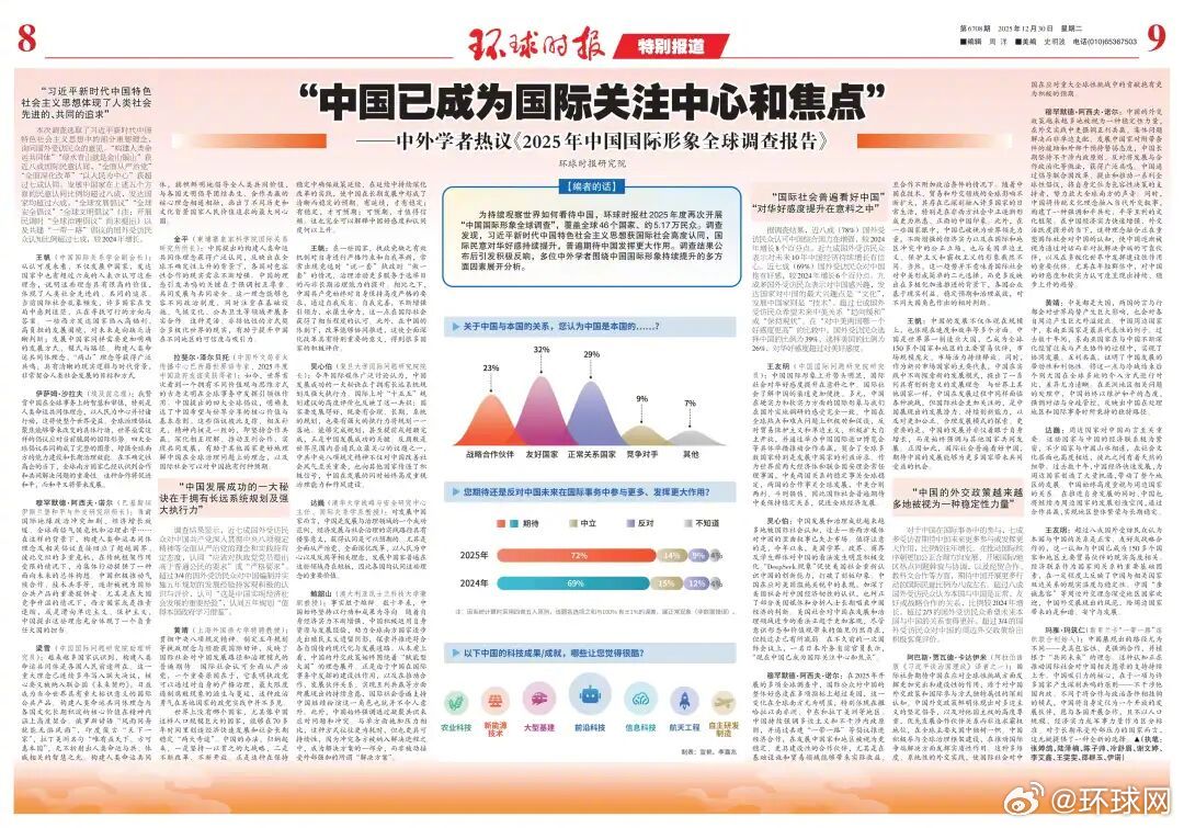 【“中国已成为国际关注中心和焦点”——中外学者热议《#2025年中国国际形象全球调查报告#》】编者的话:为持续观察世界如何看待中国,环球时报社2025年度再次开展“中国国际形象全球调查”,覆盖全球46个国家、约5.17万民众。调查发现,习近平新时代中国特色社会主义思想获国际社会高度认同,国际民意对华好感持续提升,普遍期待中国发挥更大作用。调查结果公布后引发积极反响,多位中外学者围绕中国国际形象持续提升的多方面因素展开分析。阅读全文:“中国已成为国际关注中心和焦点”——中外学者热议《2025年中国国际形象全球调查报告》
