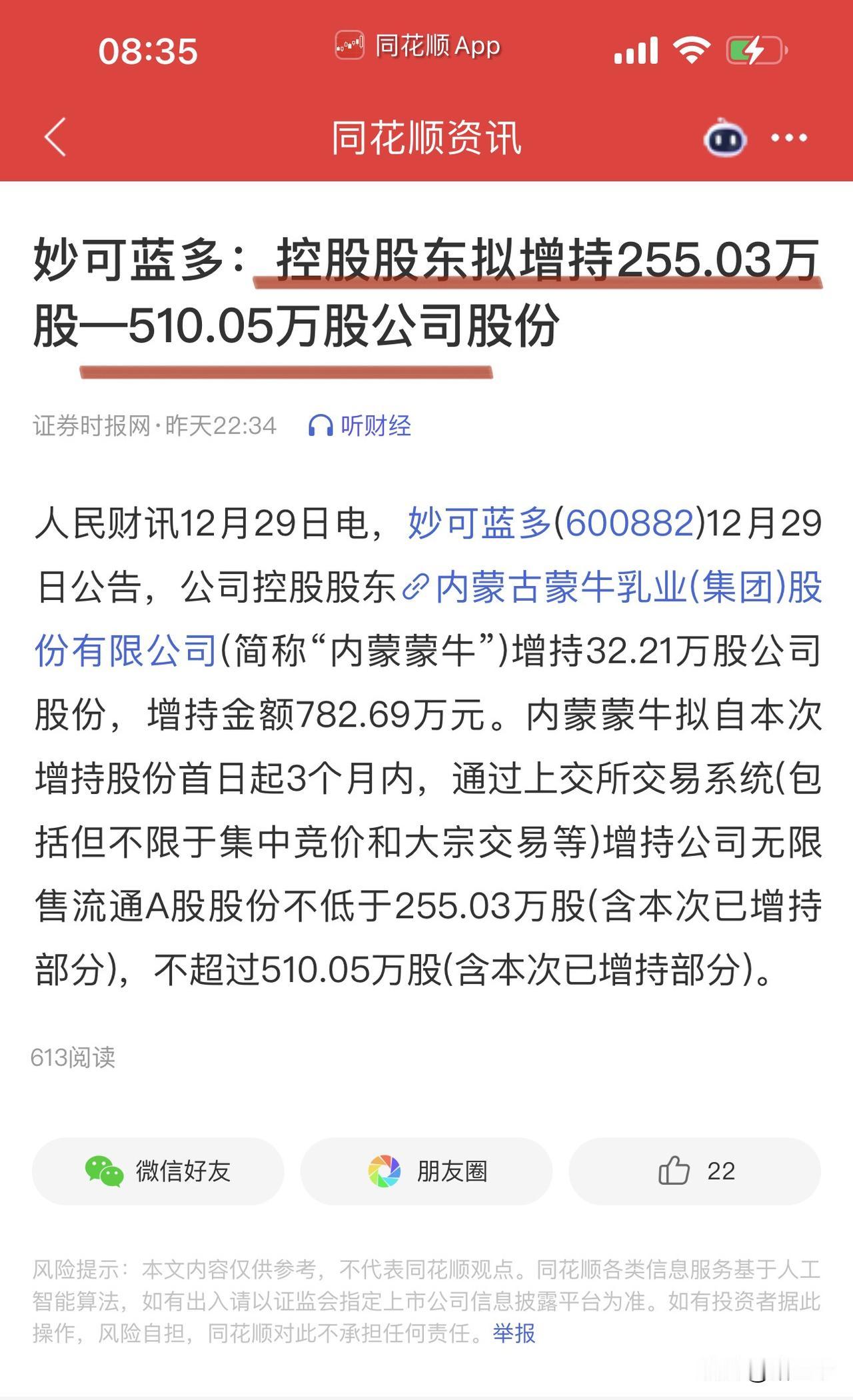 隔夜A股市场高辨识度标的两个没想到! 面临重大损失风险的妙可蓝多盘中跌停,盘后大股东蒙牛宣布增持。蒙牛和伊利在奶酪赛道暗自角力,蒙牛将妙可蓝多收入麾下,伊利妙飞奶酪打擂台。妙可蓝多在几番激烈市场拼杀后脱颖而出成为市场第一。创新型推出常温奶酪,并积极扩展家庭佐餐,曾经是A股消费大牛股。本轮熊市最低干到11元牛市最高反弹33-34元完成任务。市场继续保持对这家儿童食品赛道的看好。 锂矿资源股龙头赣锋锂业因涉嫌内幕交易被司法立案,从披露的信息看涉案金额不大。结合上下游博弈,暗语隐藏意义更深刻。三千真是乌鸦嘴,昨晚刚表扬完它本轮比天齐锂业领先半个身位。这是给天齐锂业追赶的机会呀。电池短期利空回调就是机会。明年电池和储能将迎来新的需求高峰…
