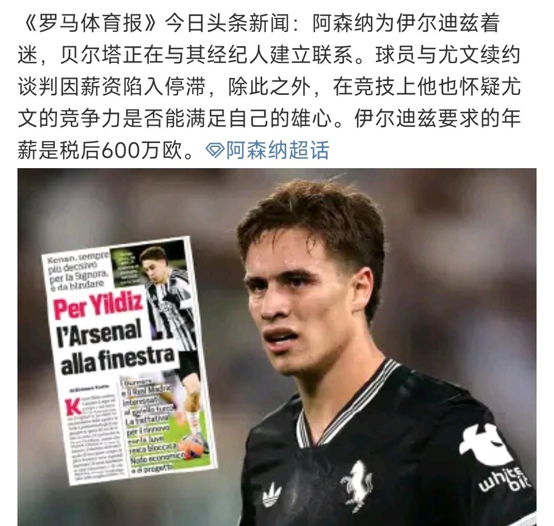 阿森纳要买伊尔迪兹,利物浦也要买。 尤文图斯给不起他600万欧元年薪。 英超两大豪门看到,马上就来抢了。 本赛季伊尔迪兹发挥挺好,又年轻。 意甲终究留不住他,去哪个豪门好呢?[抠鼻]