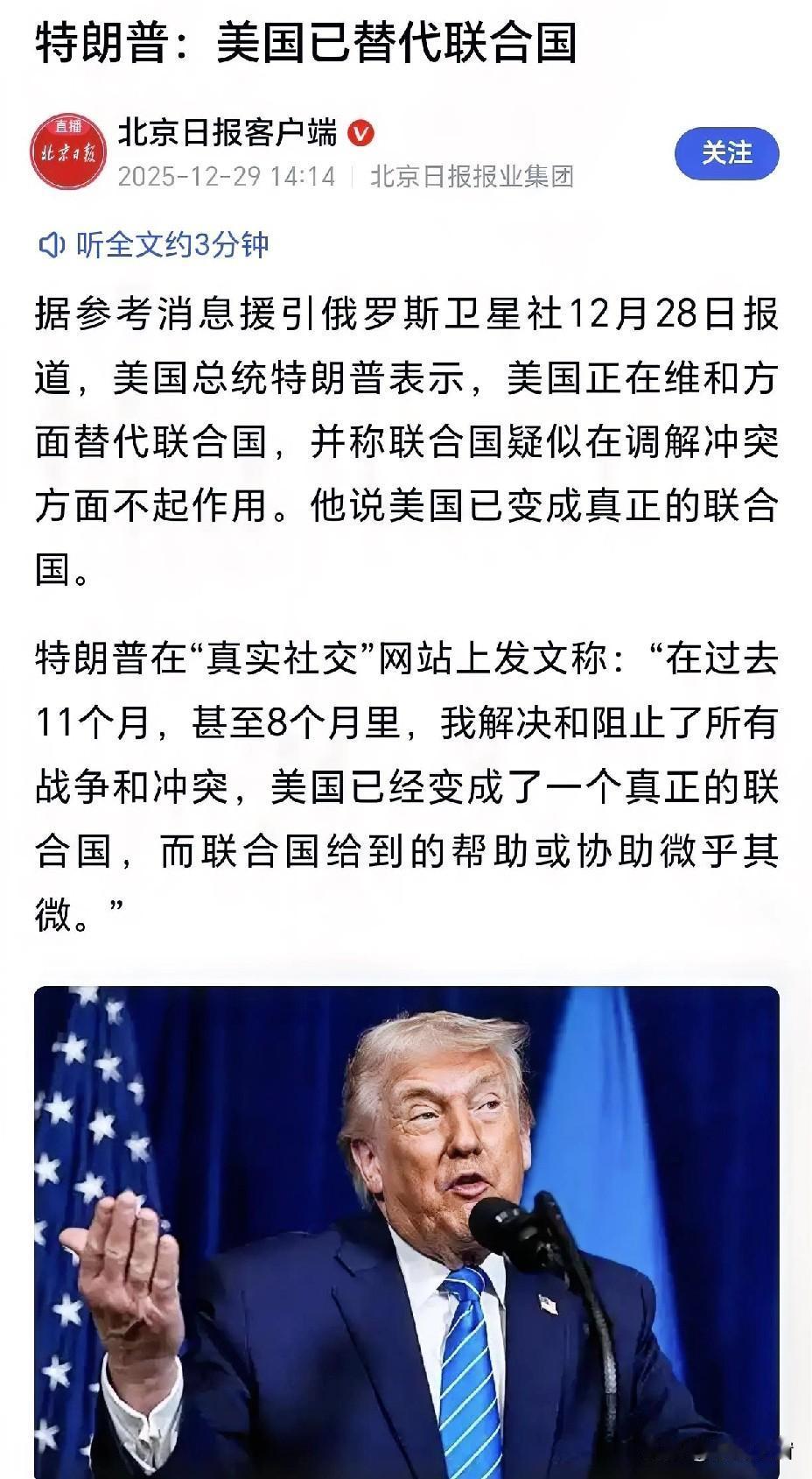 别光嘲笑特朗普“美国替代联合国”的话狂妄,换个角度看,这何尝不是戳中了联合国的现实困境?现在的联合国常被大国博弈绑住手脚,调解冲突时常常“慢半拍”,而美国凭借自身影响力,确实在不少热点问题上能快速介入。特朗普说自己解决了多场冲突虽有水分,但他敢主动下场斡旋俄乌、巴以问题,比联合国的“光喊不练”多了点实际动作。再说美国拖欠会费,本质是对联合国效率低下的抗议——交了钱却看不到实效,换谁都不乐意。与其说特朗普想搞“美国霸权”,不如说他点破了真相:当联合国难以履行职责时,自然会有国家站出来补位,这可不是单纯的狂妄,而是现实催生的结果! 联合国 中国联合国 联合国 中国联合国地位 联合国费用 美国联合国代表