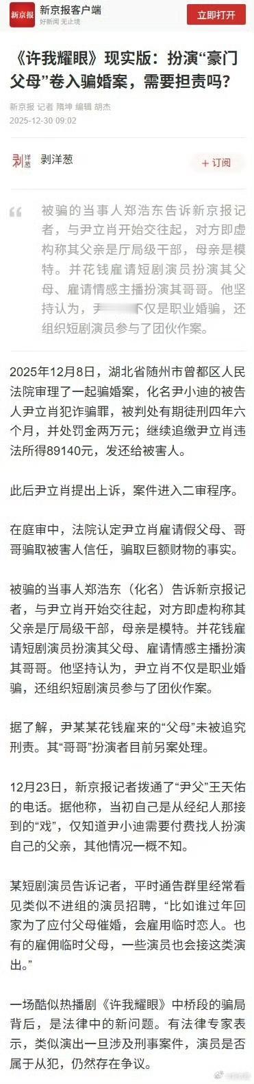 说艺术创作源于生活一点不假, 《许我耀眼》现实版骗婚案, 女子雇演员扮演厅管父亲模特母亲。 湖北女子尹某某自2022年起,虚构“1994年出生、父亲为厅官、母亲是模特”的豪门人设,雇佣短剧演员王天佑、郑晓燕见男方家长,甚至租别墅、伪造金条和银行存单作陪嫁。警方查实其真实身份为1989年生、已婚且育有两子,在婚姻存续期诈骗至少5名男性,总金额超18万元。 尹某某多次网购假B超单谎称怀孕索要营养费;婚礼中用假存单和镀金“金条”充场面;被识破后,“哥哥”扮演者协助转移14.8万元彩礼。 在我看来,这场骗局的荒唐之处,恰恰暴露出部分人对“豪门人设”的盲目追捧。若不是男方被所谓的厅官父亲、模特母亲的光环迷了眼,又怎会对那些破绽百出的伪装视而不见?镀金金条、假存单、雇来的演员,这些拙劣的伎俩能屡屡得手,说到底还是虚荣心在作祟。 尹某某的行为既践踏了他人的信任,也触碰了法律的红线,等待她的必然是严惩。而那些被欺骗的受害者,也该从中警醒:感情里最忌掺杂功利心,抛开浮华的包装,真诚才是最可贵的底色。