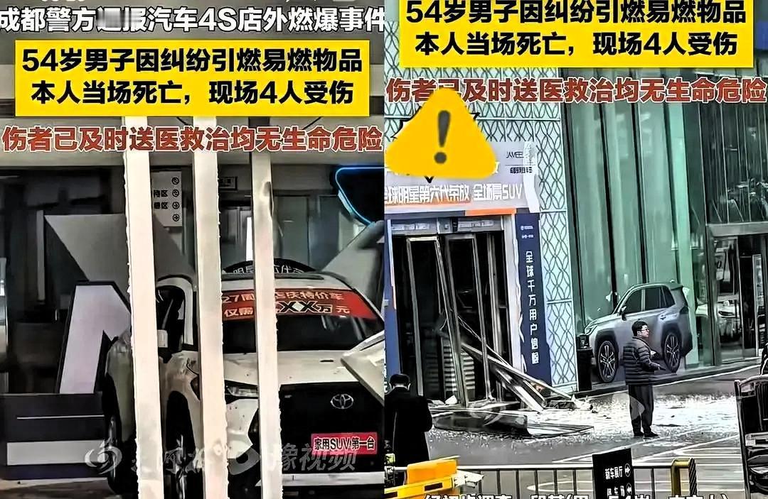 成都这一炸,太惨烈! 12 月 28 号,54 岁的段某绑着炸药就冲进 4S 店点火了,现场那叫一个…… 自己失去性命,还让4名无辜路人受伤,这样的结局任谁看了都揪心。 必须先把话讲透:无论有多大的委屈,用伤害自己和他人的方式解决问题,都是大错特错,这没有任何辩解的余地。但骂过之后,我们更该追问的是,他为什么会走到这一步? 网传他前前后后跑了好几趟4S店,手里攥着收据和聊天记录,就想讨个准话,可换来的只有“等流程”“找负责人”的敷衍。 他可能不懂怎么拨打12315,不知道市场监管部门的投诉渠道在哪,只能用最笨拙的方式守在店里,盼着有人能出面解决。 毕竟年底了,那点定金在商家眼里或许不值一提,在他这儿,可能就是一家人几天的菜钱,是老人的药费,是能过个安稳年的盼头。 相信不少人都有过类似的经历:交钱时商家笑脸相迎,承诺得天花乱坠,退钱时就百般推诿,“按流程”成了他们屡试不爽的挡箭牌。 维权的途径其实有不少,但对那些不懂规则、没时间没精力折腾的普通人来说,那些流程就像一道难以跨越的坎。 这场悲剧里没有赢家,无辜路人平白无故遭了殃,段某也为自己的极端行为付出了生命的代价。真正该反思的是那些耍无赖的商家:你眼里的一笔小钱,可能是别人的救命钱! 收钱时有多积极,退钱时就该有多痛快,给个明确答复、定个具体时限,真的没那么难。 别让“按流程”变成“拖死你”,别把普通人的维权路逼成绝路。监管部门也该加大力度,整治商家的“拖字诀”,给维权者多开几条好走的路。