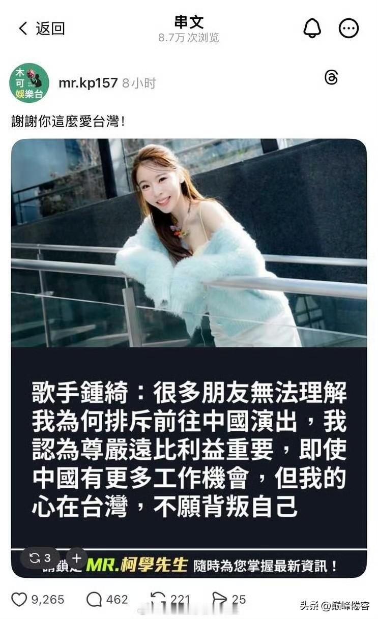 中国台湾省有些艺人,动不动喊着不愿意来大陆开演唱会!不知道的还以为是多大的“明星”,结果是无人问津的路人艺人,啥也不是,啥影响力也没有,啥大陆粉丝也没有,就是硬蹭大陆的流量意欲在台湾收割一波井底之蛙脑残粉!