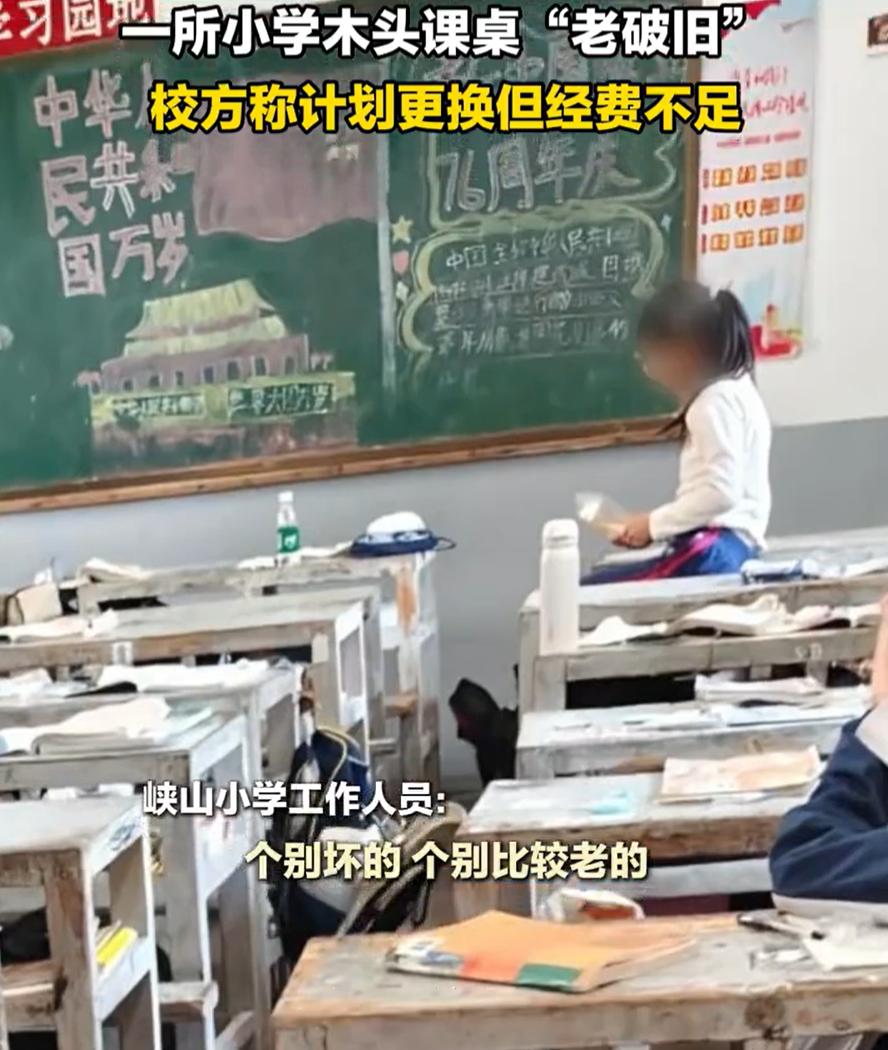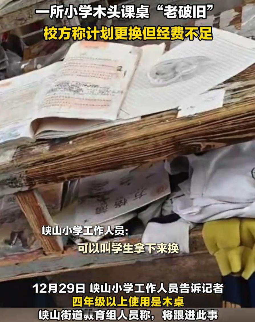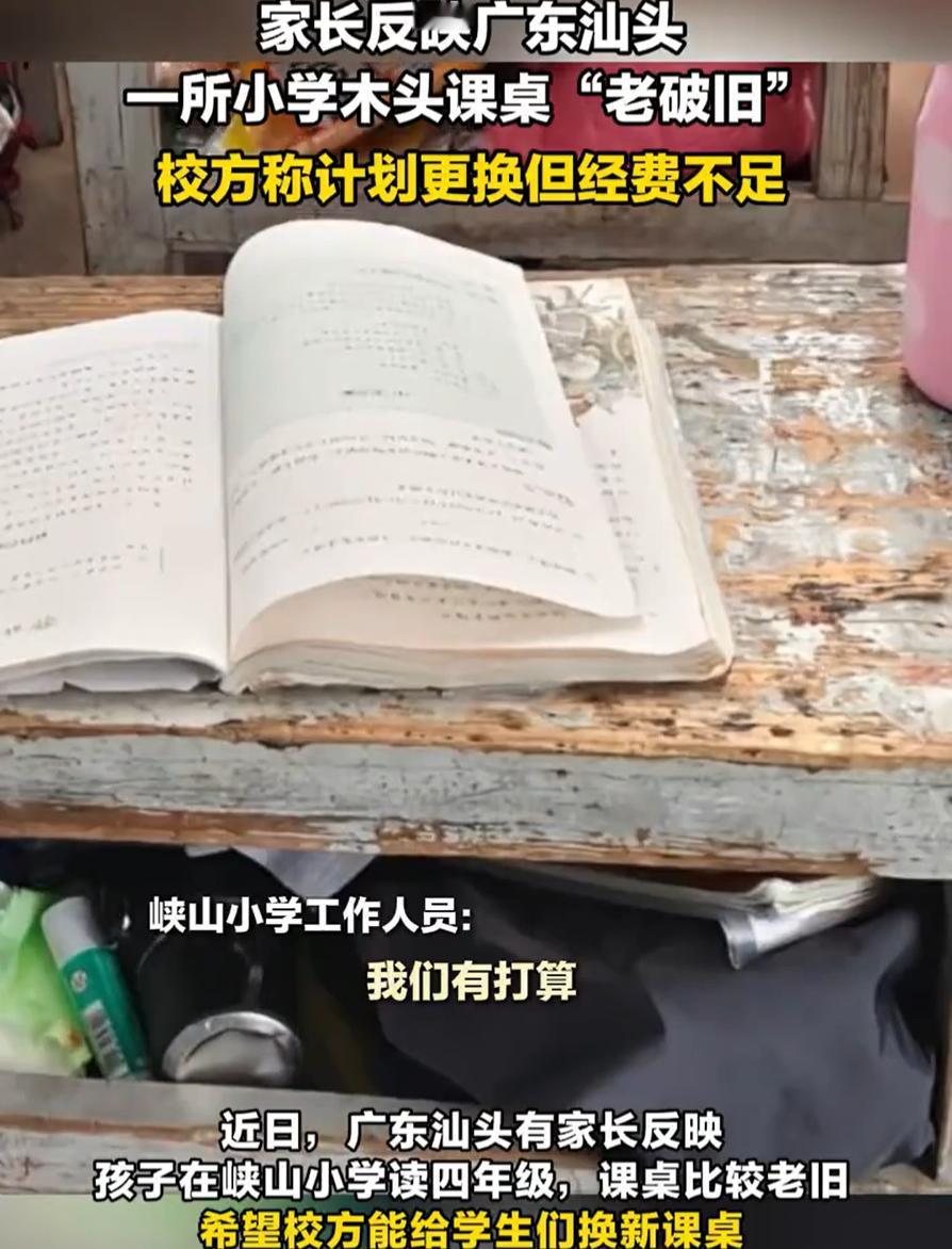 “不可思议!”广东汕头,一位家长在网上吐槽,现在孩子在上小学四年级,可孩子班级里的书桌却相当老旧,大家本来想着是家长矫情,可看到家长发来的图片直接惊呆,没想到现在还有学校再用这样的书桌。网友:捐给南博吧,这好歹也算文物了 从家长发的视频中能看到,这课桌是实木的,款式很旧,桌肚还是敞口的,没有任何现代课桌的调节功能或塑料材质。边角磨得圆润,一看就不是用了一两年的状态,更像是从前辈们一路传下来的老物件。说句实在的,这样的桌子放在仓库里当陈列都不违和,却还在正常教学中使用,难免让人心里咯噔一下 对此,学校方面回应,学校一二三年级都是单人单桌的,四年级以上都是木桌的,本来是打算换的,但学校的经费有限,如果特别老的桌子,学生可以找到学校进行更换 对此,很多网友表示不理解 有网友说:如果不是视频发到网上,我真的是不相信第一经济大省竟然还有这种课桌。我30年前在贫困县读小学,木制的桌椅也比这个新 还有网友调侃:这就是偶像剧里,男女主毕业好久,还能回学校找到当初的课桌 这件事真正戳人的地方,不是那张桌子有多破,而是大家突然意识到,孩子每天接触最久的东西,原来可以这么不起眼。教育不只是课程表和成绩单,坐得舒不舒服,写字顺不顺手,同样影响学习状态。对孩子来说,这些细节不会写进作文,却会慢慢积累成感受 在我看来,家长把问题发出来,并不算小题大做。很多改变,本来就是从一次看见开始的。学校经费有限是现实,合理规划同样重要。课桌不需要多豪华,安全、稳当、符合孩子身高就够了。能不能定期排查,整体更换,而不是等个别学生来申请,这才是关键 家长称木头课桌“老破旧” 校方回应