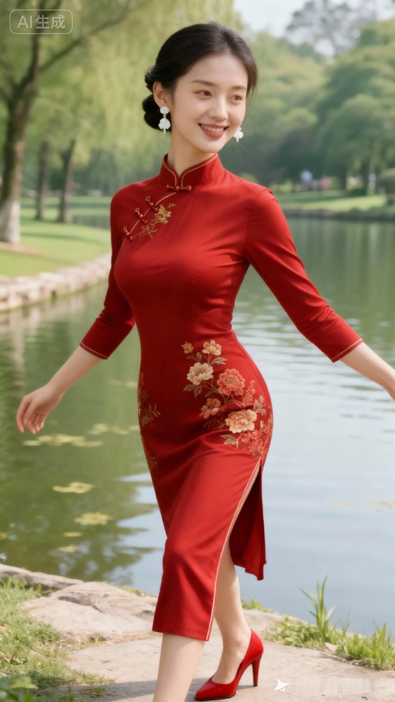 这位美女穿着旗袍在湖边散步。