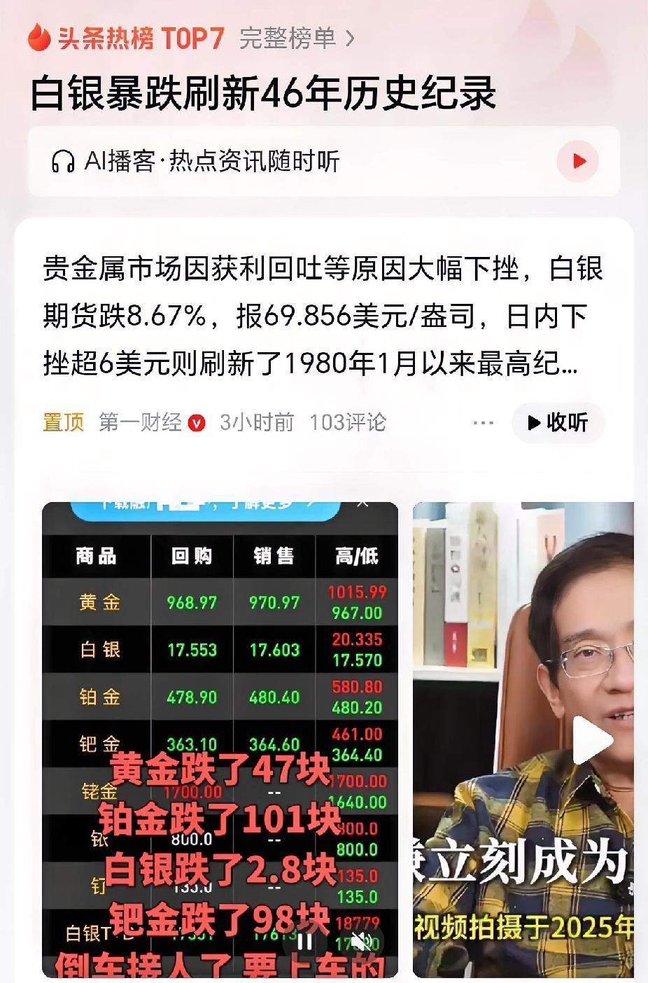 心在滴血! 昨夜白银这一刀,真是插在了心窝里! 谁能想到,昨天还是人人喊冲的“大牛市”,一夜之间就成了屠宰场! 说实话,这次跌得也太狠了点,直接刷新了46年的老黄历! 昨天的行情,真是活久见。早上还看着它蹭蹭往上涨,眼看着就要破新高,结果下午画风突变,跟跳水似的往下砸。听说是上面怕大家玩得太疯,直接出手提高了保证金,这就跟当年1980年“白银星期四”崩盘时一个路数。这下好了,杠杆高的朋友估计这会儿连裤衩都得输进去了。 看着K线图,比过山车还刺激,就是这票价太贵,咱老百姓有点坐不起。 原本以为抱着“穷人黄金”能发笔小财,结果这泡沫吹得越大,破的时候声音越响。现在这世道,想靠点小聪明赚大钱,咋就这么难呢?市场真是半点情面都不讲,昨天有多疯狂,今天就有多凄惨。 这时候可得管住手,别看跌得惨就想抄底,小心底下还有十八层。 这会儿恐慌情绪正上头,谁也不知道明天还会跌多少。要我说,这时候最好的策略就是“不动”,或者干脆离场去喝碗胡辣汤压压惊。毕竟,留得青山在,不怕没柴烧,你说是不是这个理儿?