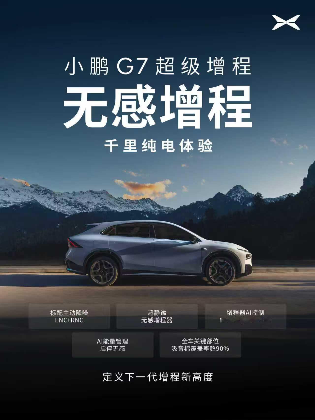 1704公里超长续航SUV小鹏G7来了小鹏鲲鹏超级增程家族首款SUV——小鹏G7超级增程来了,直接把综合续航上限拉到新高度:全球最长1704公里!何小鹏称:一车双能,是小鹏G7超级增程给日常与远方的答案。430公里的纯电续航满足城市通勤,1704公里综合续航让今年春节回家、长途远行的自由度拉满,不挑季节不挑路线,实现续航自由以及用电自由。满配实力,全程安心:800V+5C超充AI电池,实现12min充电314km;55.8kWh 超大电池 + 60L 大油箱,自带超级充电站;标配ENC+RNC 双主动降噪,实现无感增程,静谧出行!小鹏G7超级增程 更是融合了有效算力高达2250TOPS的极致科技与远超同级的超大空间。既要实现说走就走的自由,更要满足每一程都从容惬意的享受。