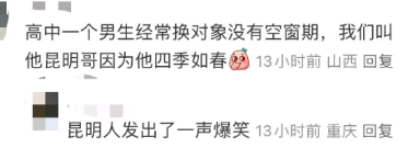 高中一个男生经常换对象没有空窗期,我们叫他昆明哥因为他四季如春