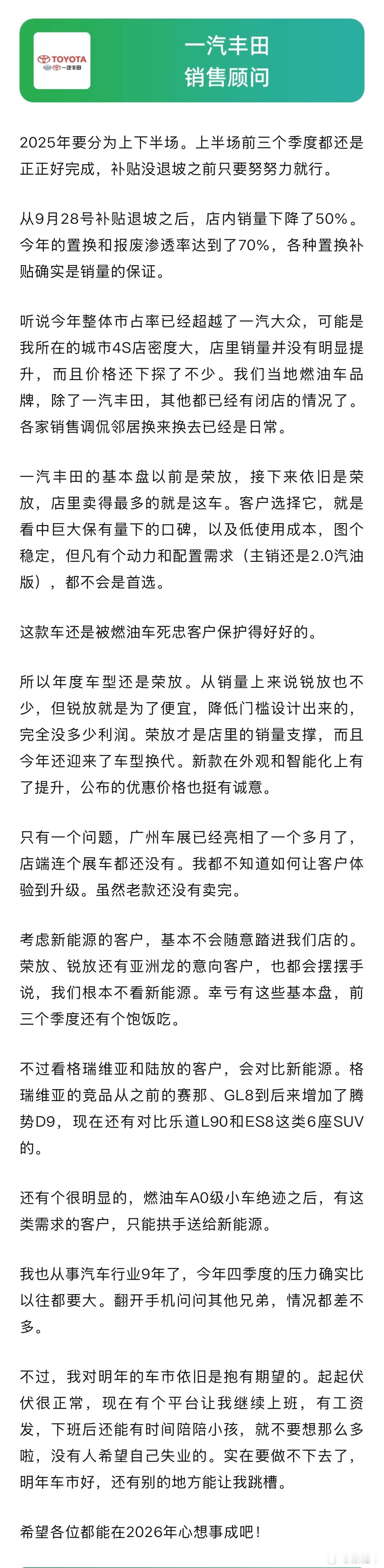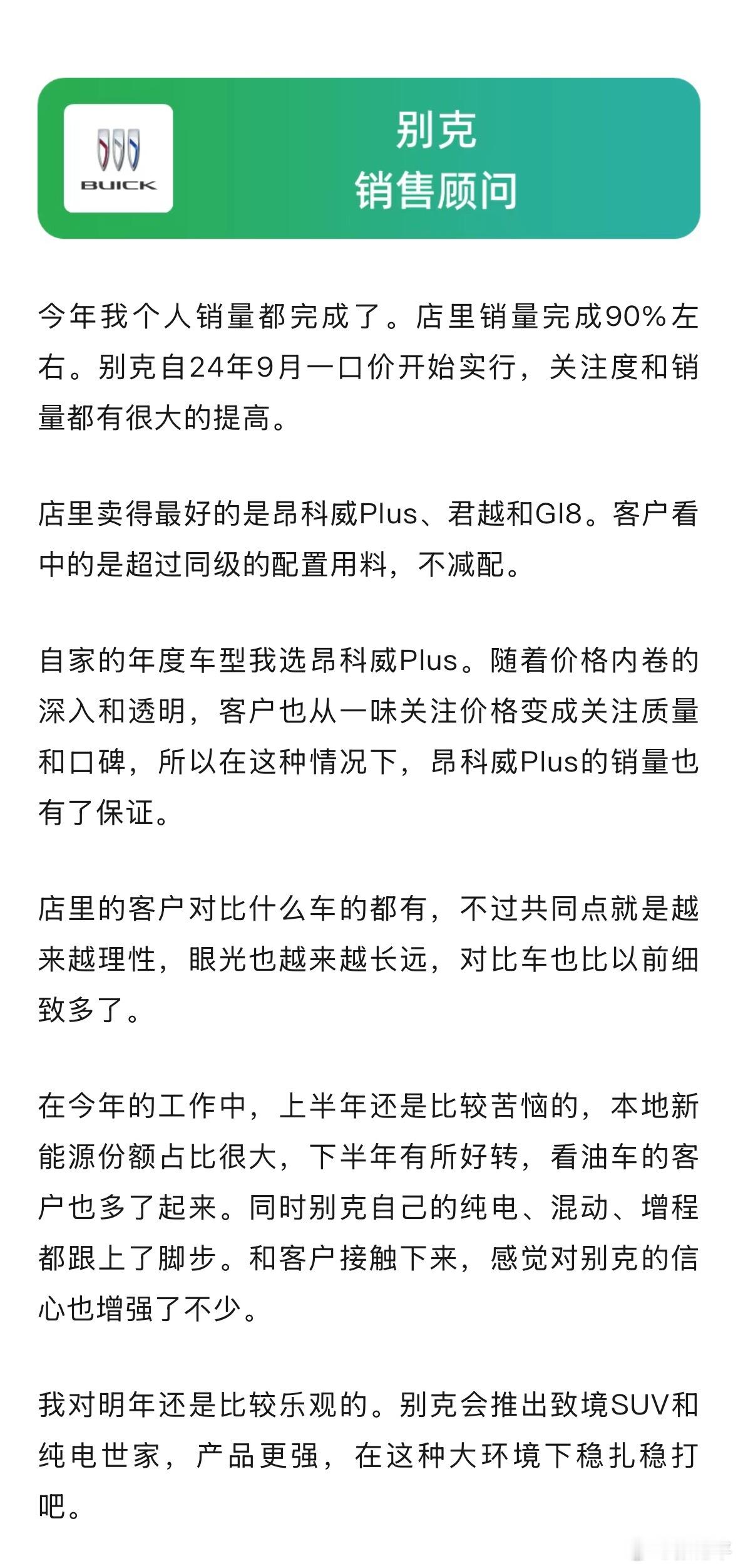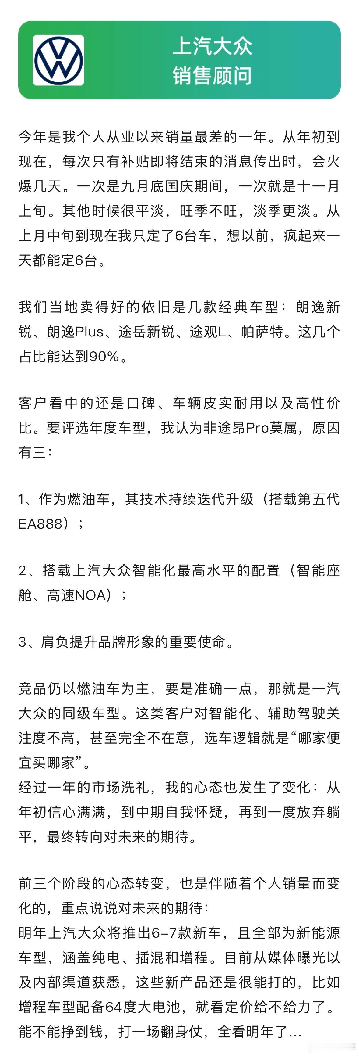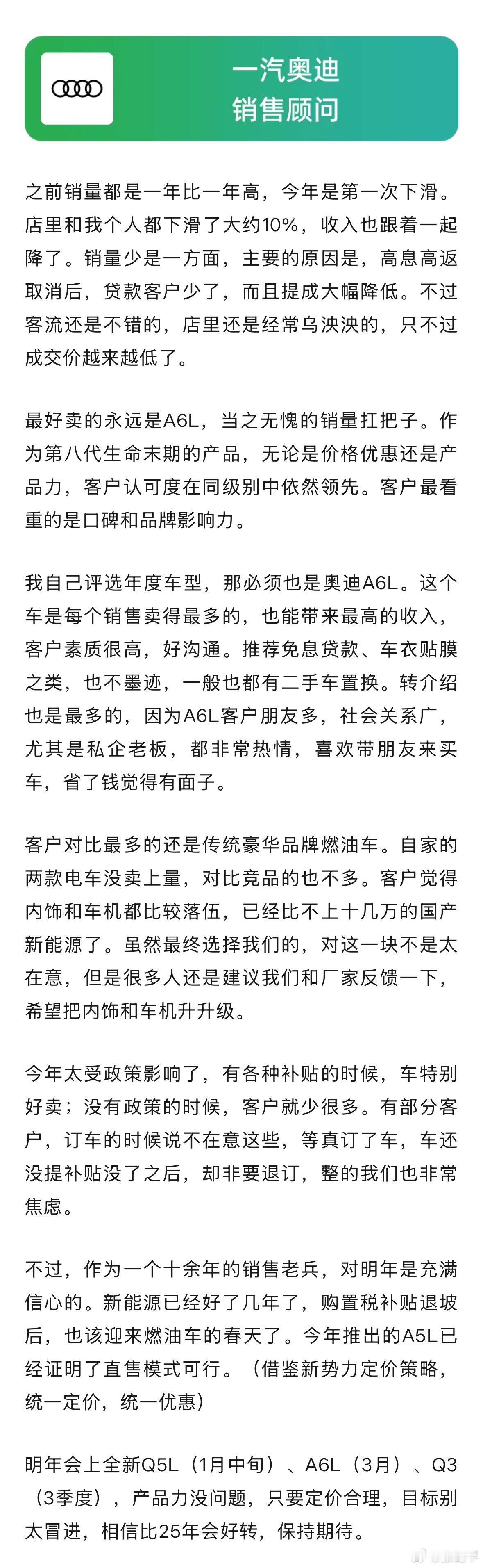 合资品牌销售的年度个人总结先来了,据说大家都太有表达欲了,整体来看都对明年抱有很好的期许,我觉得这份心态很重要。东风日产:今年最大的感受,是品牌关注度提升了。日产N系列一出来,很多原本只看电车性能的客户,现在也开始关注舒适度了。一汽奥迪:最好卖的永远是A6L,当之无愧的销量扛把子。作为第八代生命末期的产品,无论是价格优惠还是产品力,客户认可度在同级别中依然领先。别克:今年我个人销量都完成了。店里销量完成90%左右。别克自24年9月一口价开始实行,关注度和销量都有很大的提高。上汽大众:明年上汽大众将推出6-7款新车,且全部为新能源车型,涵盖纯电、插混和增程。目前从媒体曝光以及内部渠道获悉,这些新产品还是很能打的,比如增程车型配备64度大电池,就看定价给不给力了。一汽丰田:一汽丰田的基本盘以前是荣放,接下来依旧是荣放,店里卖得最多的就是这车。客户选择它,就是看中巨大保有量下的口碑,以及低使用成本,图个稳定,但凡有个动力和配置需求(主销还是2.0汽油版),都不会是首选。大v聊车