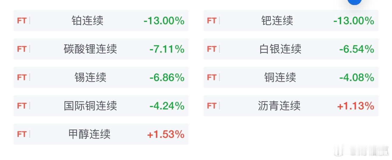 早盘开盘,国内期货主力合约多数下跌。铂跌停,跌幅13%,报589.85元/克;钯跌超12%,碳酸锂跌超7%,沪银、沪锡跌超6%,沪铜、国际铜跌超4%。涨幅方面,沥青、甲醇涨超1%。美股贵金属板块领跌