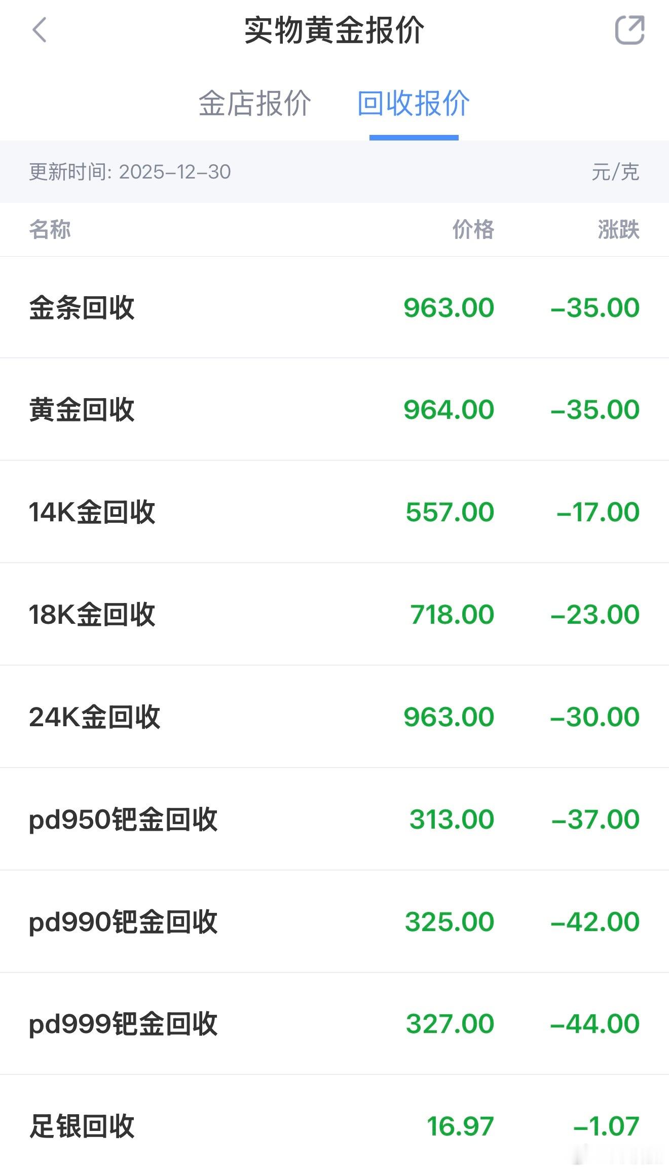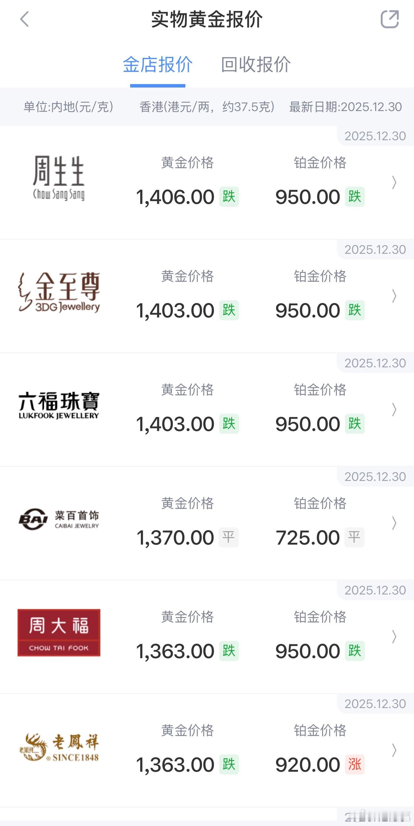 金饰跌破1400元,黄金牛市就此终结?12月30日早盘黄金价格小涨,现货黄金涨0.09%,报4335.735美元/盎司,COMEX黄金期货涨0.27%。不过前一日纽约尾盘,二者遭遇重挫,单日跌幅均超4%,单日均跌超200美元,现货黄金创10月21日以来最差单日表现。受此影响,国内部分品牌金饰价格大幅下跌。30日,周生生金饰报1353元/克,单日下跌53元/克;老庙黄金报1359元/克,单日下跌44元/克;老凤祥报1363元/克,单日下跌45元/克,纷纷跌破1400元关口。此前黄金上涨受地缘政治、美元走弱等因素推动,此次下跌或与地缘风险降温、投资者获利了结有关。不过长期来看,美联储2026年降息预期、全球央行购金等因素仍支撑金价,后续走势有待进一步观察。金饰价格跌破1400元关口