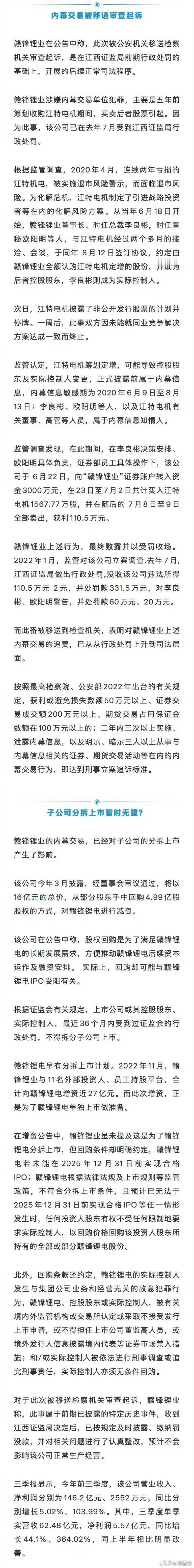 赣锋锂业内幕交易被诉,子公司上市梦要碎?一桩五年前的内幕交易,让千亿锂矿龙头赣锋锂业(002460.SZ)在受行政处罚后,又面临司法追责。12月29日晚,赣锋锂业披露,因涉嫌内幕交易罪单位犯罪,案件已移送检察机关审查起诉。2020年,赣锋锂业筹划收购江特电机期间,利用其证券账户买卖后者股票。当年6月22日,赣锋锂业转入3000万元,在6月23日至7月2日买入江特电机1567.77万股,7月8日至9日全部卖出,获利110.5万元。2022年1月监管立案调查,去年7月,江西证监局没收违法所得并罚款,对相关责任人警告罚款。此次移送检察机关,意味着追责从行政层面上升到司法层面。这一事件还波及子公司赣锋锂电的分拆上市计划。2022年11月,赣锋锂业与多方增资赣锋锂电近27亿元,为其单独上市做准备。但按监管规定,上市公司或其控股股东、实控人近36个月内受证监会行政处罚,不得拆分子公司上市。赣锋锂电若未能在2025年12月31日前实现合格IPO,投资人股东有权要求实控人回购股份。赣锋锂业称,此事是特定历史事件,已及时披露、缴纳罚没款并整改,预计不影响正常生产经营。今年前三季度,该公司业绩有升有降,三季度表现亮眼。不过,子公司上市前景仍充满变数。(第一财经)赣锋锂业涉内幕交易罪
