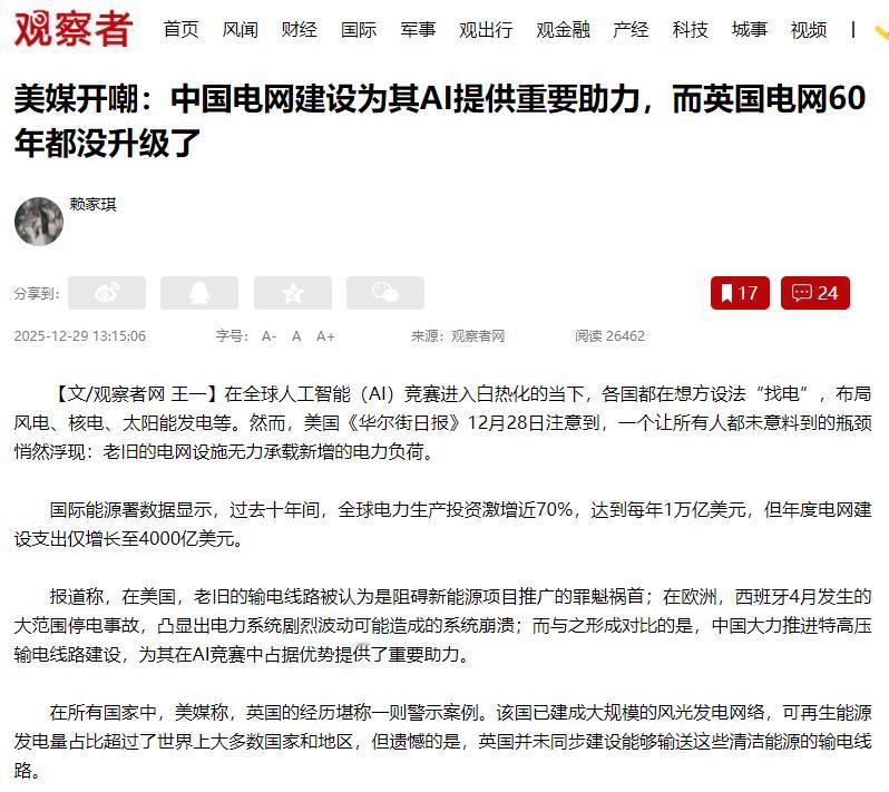 老大不要嘲笑老二!英美AI发展瓶颈还真是差不了哪里去。在英国为电网发愁的时候,美国也在为绕线工数量不够发愁,结果美媒开嘲:中国电网建设为其AI提供重要助力,而英国电网60年都没升级了。 现在全球都在抢人工智能这块蛋糕,可最关键的电力保障,英美两国都掉了链子。有意思的是,美国媒体还嘲笑英国电网60年没升级,拖了AI后腿,却没看见自己家麻烦也不少。 英国愁发的电送不出去,美国愁连造电网设备的工人都缺,说白了就是大哥别笑二哥,俩都不行。这俩国家的AI野心,全被老旧电网卡住了,看着真让人觉得好笑。 先说说被嘲讽的英国。这些年英国建了不少风电场,苏格兰的海风发电都成了全国第一大电力来源,可再生能源占比比多数国家都高。可电发出来了,却送不出去,问题就出在电网上。 英国电网都是几十年前的老东西,快60年没好好升级了,苏格兰的电要送到南部人口多、工厂多的地方,老旧电网根本扛不住,还容易出故障。现在新建个风电场想接电网,得等5到10年审批,好多项目都黄了。 别觉得电网老点没事,对AI来说这就是致命的。AI背后的大数据中心特费电,就是个“电老虎”。 英国本来想靠新能源撑AI发展,结果电送不出去,数据中心接不上稳定电,AI训练动不动就中断。 去年就有英国科技公司说,因为供电不稳,原本3个月能完成的项目拖了半年,丢了不少订单。美媒嘲笑得挺欢,却没想想自己家的问题更具体。 美国AI产业比英国大,野心也大,可电力保障照样掉链子,核心问题是缺造电网设备的工人。 有个叫“绕线工”的工种,专门造电网关键设备变压器,没他们不行。这工种得培训3到5年才能上岗,还没法用机器替代,可美国熟练工人流失率高达30%,年轻人嫌工资低不愿来。 工人不够,变压器就严重缺货。2025年数据显示,美国小型变压器缺12万多台,大型的也缺1万多台,80%得靠进口,运过来要半年到一年。 现在美国有500多个超大规模数据中心,还计划再建280个,可这些数据中心想接电网,平均要等7年。 德勤说2035年AI数据中心电力需求要比现在涨30倍,可按现在进度,电力短缺至少还要持续三五年。 更坑的是,美国电网升级的成本全摊到老百姓电费里了。2022年至今平均电价涨了13%,今年三季度居民电费又涨了3.6%。 可就算涨了电费,2025到2029年要花1.1万亿美元升级电网,还因为关税涨成本,问题比英国还难解决。 其实美媒也知道中国电网能帮AI发展,却故意忽略中美差距。中国早就搞了“东数西算”,把费电的数据中心建在西部新能源多的地方,用特高压电线送电,损耗比美国低多了。 说到底,英美都是忽视了基础设施建设才卡了壳。现在拼AI,电力就是底气,光靠嘲讽别人没用,先把电网基础打牢才是正经事,这俩国家真该醒醒了。