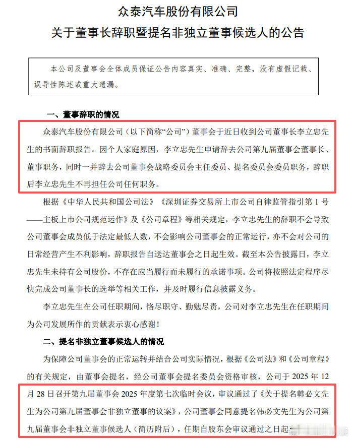 任职两个月的众泰汽车董事长辞职 众泰汽车又有新动作了,任职两个月的众泰董事长李立忠提出书面辞职报告。具体为:因个人家庭原因,李立忠先生申请辞去公司第九届董事会董事长、董事职务,同时一并辞去公司董事会战略委员会主任委员、提名委员会委员职务,辞职后李立忠先生不再担任公司任何职务。近两个月,众泰汽车在资本市场的动作频频,包括获得银行授信、并列出还款计划,另外还与上汽变速器和解获赔。而今,任职两个月的董事长提出辞职,看起来挺突然,到底是怎样的安排呢?是因为年事已高的原因吗?与此同时,公司董事会又同意提名韩必文先生为公司第九届董事会非独立董事候选人。接下来,众泰汽车会怎么走?能复活吗?拭目以待!大V聊车车圈财报