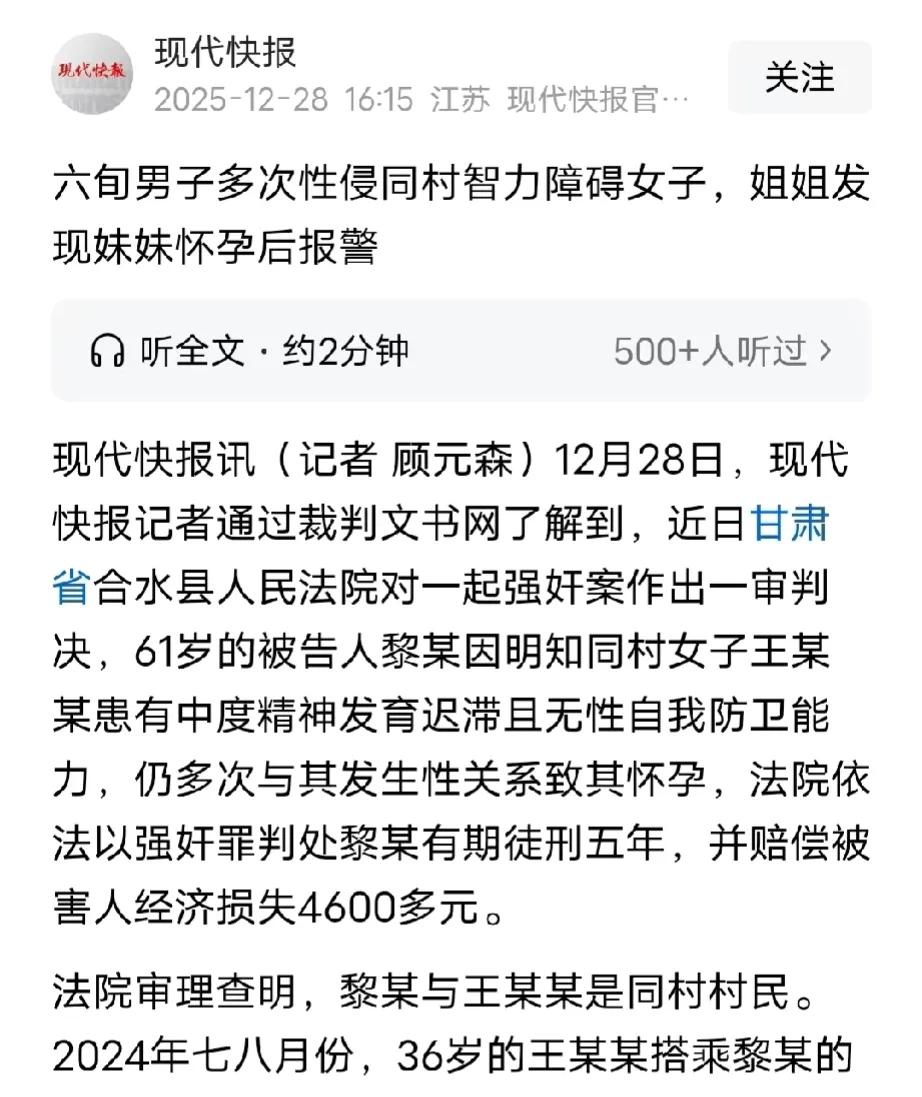 缺大德了!甘肃合水,61岁男子发现34岁女子智力异于常人,起了歹念,4个月内,男子在家中6次与女子发生关系,结果,女子怀孕了,被姐姐发现后报警,而后,姐姐带着妹妹去医院做了流产手术,最终,男子为此受到了法律的严惩! 受害者和姐姐相依为命,因为天生智力异于常人,认知水平远不如同龄人,平时说话做事都显得有些迟钝,也没什么自我保护的意识,出门买个东西都得姐姐陪着。 姐姐平时忙着打工赚钱,就尽量多抽时间照顾妹妹的饮食起居,姐妹俩的日子过得不算富裕,但也算安稳。 一开始他也就是随口和女子说几句话,后来发现女子反应慢,问什么都答不上来,甚至连基本的是非判断都没有,慢慢就起了不轨之心。 女子因为智力问题,根本不明白男子的行为意味着什么,也不知道要把这些事告诉姐姐,只是本能地觉得有些害怕,却不知道该如何反抗和求助。 那段时间里,姐姐其实也察觉到妹妹有些不对劲,总是躲着人,眼神也怯生生的,但因为工作太忙,加上女子说不清楚到底发生了什么,就没往最坏的地方想。 只是以为妹妹受了什么惊吓,还特意叮嘱妹妹不要一个人乱跑。 直到几个月后,姐姐发现女子的身体出现了明显变化,不仅肚子慢慢大了起来,还经常恶心呕吐。 姐姐这才意识到事情的严重性,又急又气,一边抱着妹妹哭,一边追问细节。 考虑到女子的特殊情况,根本没有能力抚养孩子,而且怀孕也对她的身体造成了很大的负担,姐姐只能带着她去医院做了流产手术。 手术过程中,女子因为害怕一直紧紧抓着姐姐的手,姐姐看着妹妹痛苦的样子,心里既心疼又愤怒。 术后照顾妹妹的日子里,姐姐每天都寸步不离,生怕妹妹再受到一点伤害,同时也在积极配合民警的调查,希望能让男子受到应有的惩罚。 大家都没往深处想,觉得只是邻里之间的正常往来,甚至还有人觉得女子智力有问题,男子愿意和她说话是好心。 面对身边的特殊群体,仅仅是不欺负还不够,更要多一份留意,一旦发现异常情况,就要及时介入,避免类似的悲剧发生。 法院审理后认为,男子行为已经构成了强奸罪。 当判决结果出来的时候,姐姐心里的石头才算落了地,她觉得这是对妹妹最好的交代,也希望通过这个判决,能让妹妹以后的生活能安稳一点。 有网友评论:“大爷都61岁了,本该安享晚年,却做出这种缺德事,欺负没有反抗能力的人,根本不配为人。” 还有网友表示,智力障碍群体的保护问题值得重视,像女子这样的情况,身边需要有人时刻看护,同时社会也应该给予更多的关注和帮助,建立更完善的保护机制。 姐姐虽然尽了自己最大的努力保护妹妹,但面对这样的意外,还是显得有些无力。 如果遇到类似的特殊群体,我们多一份关心,多一份留意,或许就能避免一场悲剧的发生。 对于这件事,您有什么想说的吗?欢迎评论区留言讨论。 信息来源: 现代快报 2025-12-28 《61岁男子性侵智力障碍女子致怀孕,被判5年》