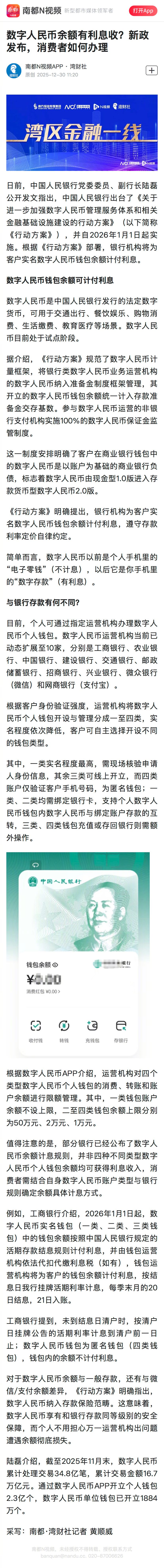#数字人民币余额有利息了#【数字人民币余额有利息收?新政发布,消费者如何办理】#数字人民币钱包余额2026年起计息#中国人民银行出台《行动方案》,自2026年1月1日起,银行机构将为客户实名数字人民币钱包余额计付利息。简单而言,数字人民币以前是个人手机里的“电子零钱”(不计息),以后它是你手机里的“数字存款”(有利息)。目前可通过10家运营机构(包括工行、微众银行、网商银行等)办理。部分银行已经公布计息规则,例如,工商银行介绍,实名钱包(一至三类)余额按活期存款计息,匿名钱包(四类)不计息。《行动方案》还明确指出,数字人民币纳入存款保险范畴。这意味着,数字人民币享有和银行存款同等级别的安全保障,个人不用担心万一运营机构出问题遭遇余额彻底损失。南都·湾财社记者 黄顺威数字人民币余额有利息收?新政发布,消费者如何办理