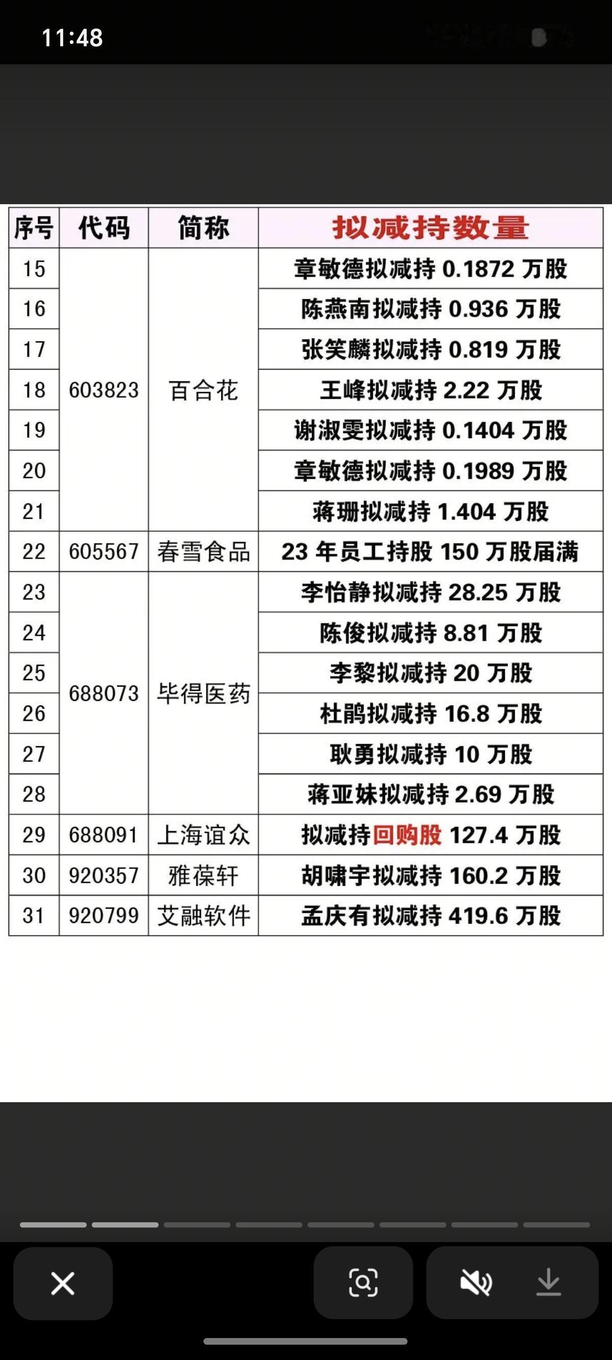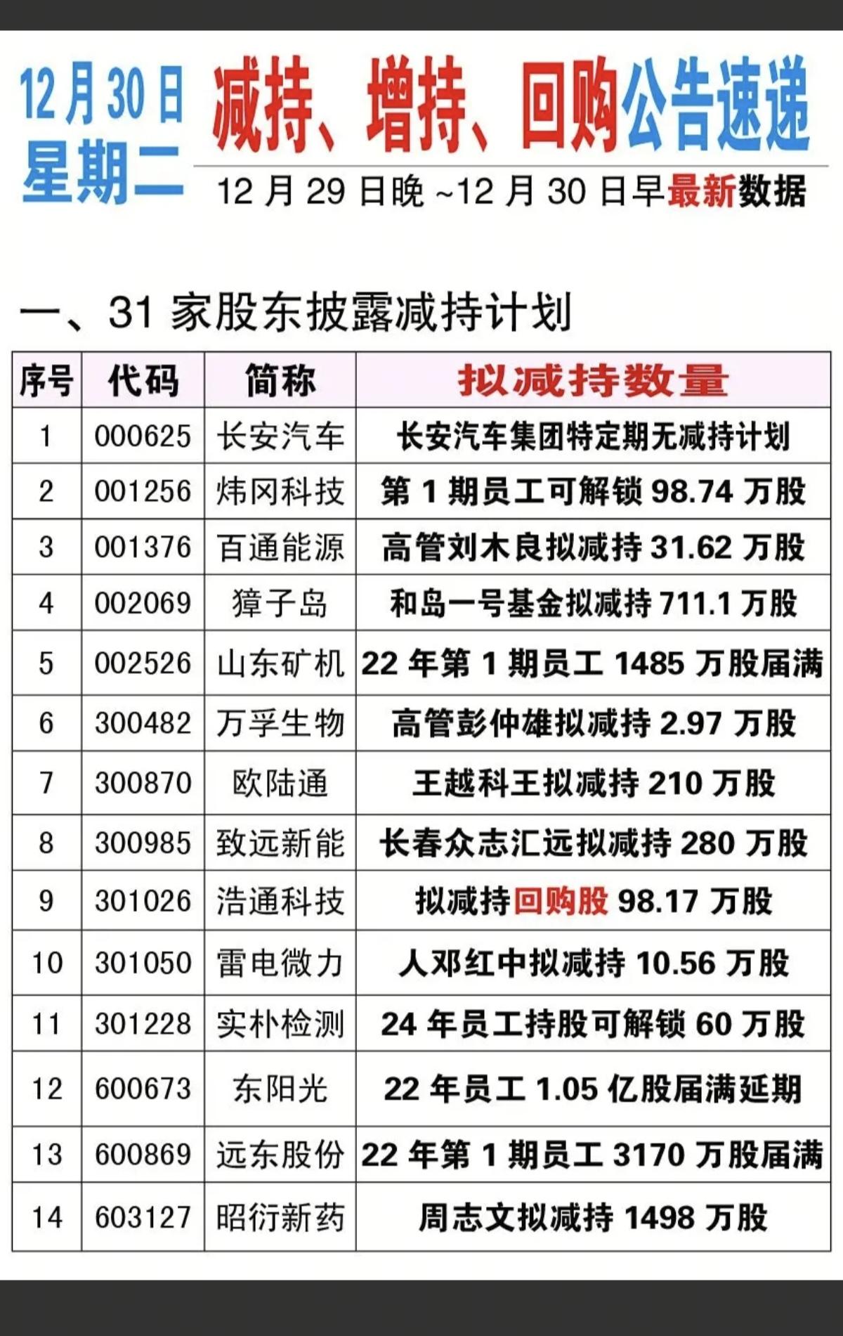 12.30周二 最新:减持,增持,回购公告 一、31家公司披露减持计划, 二、2家公司增持, 三、5家公司公告法拍股份, 四、3家公司回购计划 五、2家披露回购用途