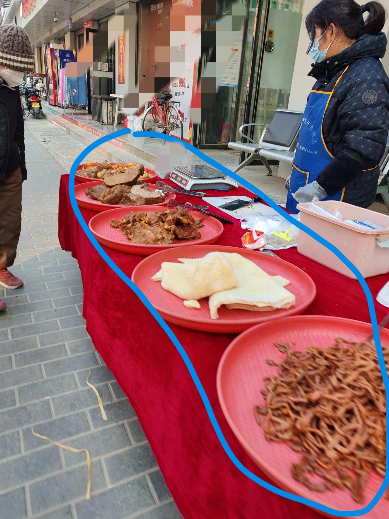 奇怪,没人买 12月30日,坐标西安。今天我出差来到了经开区所辖的一个小镇,早市还没散去,街道两旁还有不少卖瓜果蔬菜的摊位,我注意到了一个熟肉摊,情况跟城六区的早市摊差别较大。 一块红布罩着的桌子上放着五个塑料盘,盘子里装着各种肉类,女摊主介绍说是牛肚,蹄筋,牛腱肉,牛肝,牛头肉和鸭肠。 那牛肚看起来格外白,所有的熟食品均露天摆放,我问了一下价,蹄筋和牛腱肉每1斤35元,牛肝10元1斤,牛头肉20元1斤,鸭肠忘了问。 尽管这个价格很低了,但奇怪的是没有顾客,很多人看几眼就走开了。 看来大家清醒了,购买饮食不再把价格作为关键因素,更在乎质量,现在网络上报道了多起假牛肉,很多人清楚了一个个的坑,购买饮食类谨慎了。