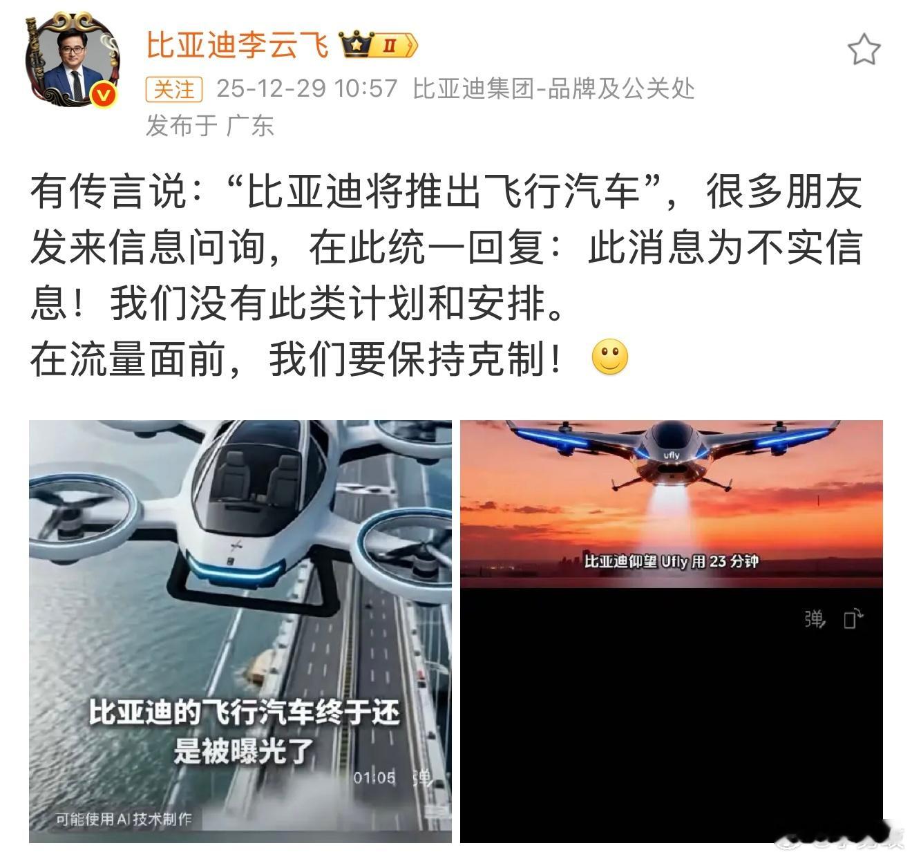 比亚迪也要做“飞行汽车”? 比亚迪李云飞:该消息为不实信息!12月29日,比亚迪品牌及公关处总经理李云飞表示,有传言说:“比亚迪将推出飞行汽车”,很多朋友发来信息问询,在此统一回复:此消息为不实信息!我们没有此类计划和安排。在流量面前,我们要保持克制!此前,有消息传闻比亚迪飞行汽车已完成跨海试飞并计划商业化运营的细节,引发了广泛关注和讨论。被辟谣的网传信息声称比亚迪已研发“仰望Ufly”飞行汽车,搭载兆瓦闪充技术(10分钟充电续航150公里)、玄鸟架构、三体式倾转旋翼设计,最高时速达350km/h等。事实上,去年以来,依托低空经济产业政策的利好,多家车企布局低空领域,造飞行汽车几乎成了“标配”。公开资料显示,小鹏汽车、吉利汽车、广汽集团、长安汽车、一汽集团等多家车企已先后宣布进入低空飞行器领域。大家怎么看待车企造飞行汽车?