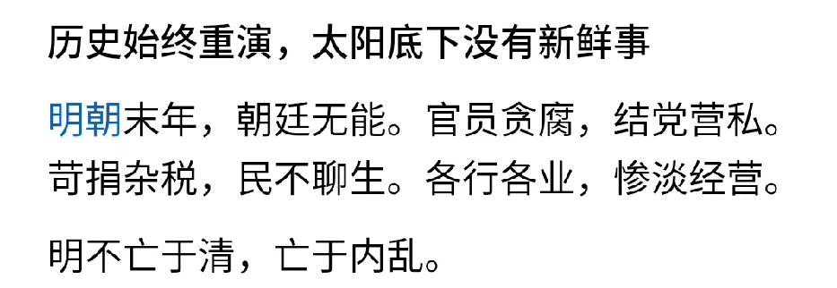 打碎旧世界,口号是创造新世界,但新世界并不新,内核和外壳甚至更腐朽。 历史上的农民起义,建立的新政权并不比之前的政权更高明,甚至还要比以前的政权更落。 唐的博大包容,宋的雍容雅致,元的薄税宽宏,明肯定比不了。 从制度上,明太严苛,殉葬,严厉打击商业和文人,养一大堆皇族,它是倒退的。 太平天国上层的特权,达到历史之最。 周而复始的循环,无非是一次又一次地把"御民、辱民和弱民"发展到极致。 这是一个十分清晰的脉络。 中国人特别聪明,但总是把聪明发挥到相反的方向。 自己斗自己,削弱的是整个族群。 我们近代的落后,主要还是自己搞自己造成的,不能凡事都赖别人。