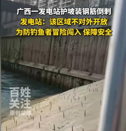 广西桂平一电站护坡装钢筋倒刺,瞬间引发全网热议,两方观点各执一词,谁也说服不了谁。 12 月 28 日,桂平某发电站护坡上出现大量钢筋倒刺,密密麻麻格外扎眼。29 日电站工作人员回应,此举实属无奈,不少钓鱼者无视现场提醒,执意翻越围挡入内钓鱼,多次劝阻均无效果,为保障场地安全,才选择安装倒刺。 事件发酵后,网友立场直接两极分化。支持方直言装得好,吐槽部分人毫无边界感,发电站属危险区域,本就不是钓鱼场所,无视规则就该有相应约束,倒刺能有效劝退违规者。反对方却满心担忧,直言倒刺过于凶险,但凡有人不慎摔倒,被倒刺刮伤甚至挂住,后果不堪设想。 有网友一语道破核心争议:甭管是否违规翻入,一旦有人因此受伤,家属必然会追责电站。一方是电站屡劝无果后的无奈防护,一方是无差别隐患带来的风险,违规钓鱼触碰安全红线,硬核防护又暗藏伤人危机,两难处境让众人各有看法。 违规闯入不守规矩不可取,以锋利倒刺防护也难言妥当。