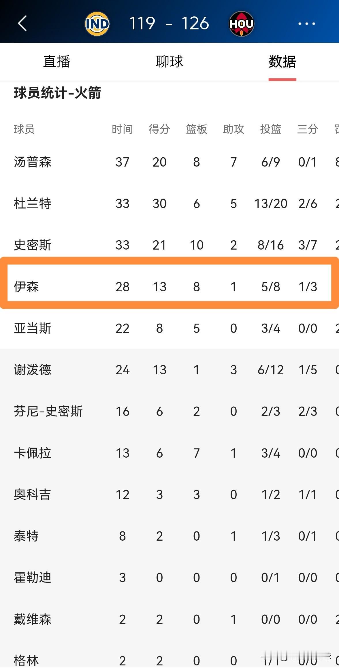 火箭大将伊森真是坐稳主力位置了!在今天火箭主场以126:119击败步行者的比赛中,伊森首发出战28分钟,投篮8中5,其中三分球3中1、罚球2中2得到13分8篮板1助攻1抢断1盖帽,他的场上正负值为+9。 老实说,以火箭目前的阵容配置来看,伊森的主力位置是很难被撼动的,只要他能够保持稳定的表现,我相信伊森的球队地位会更加稳固。