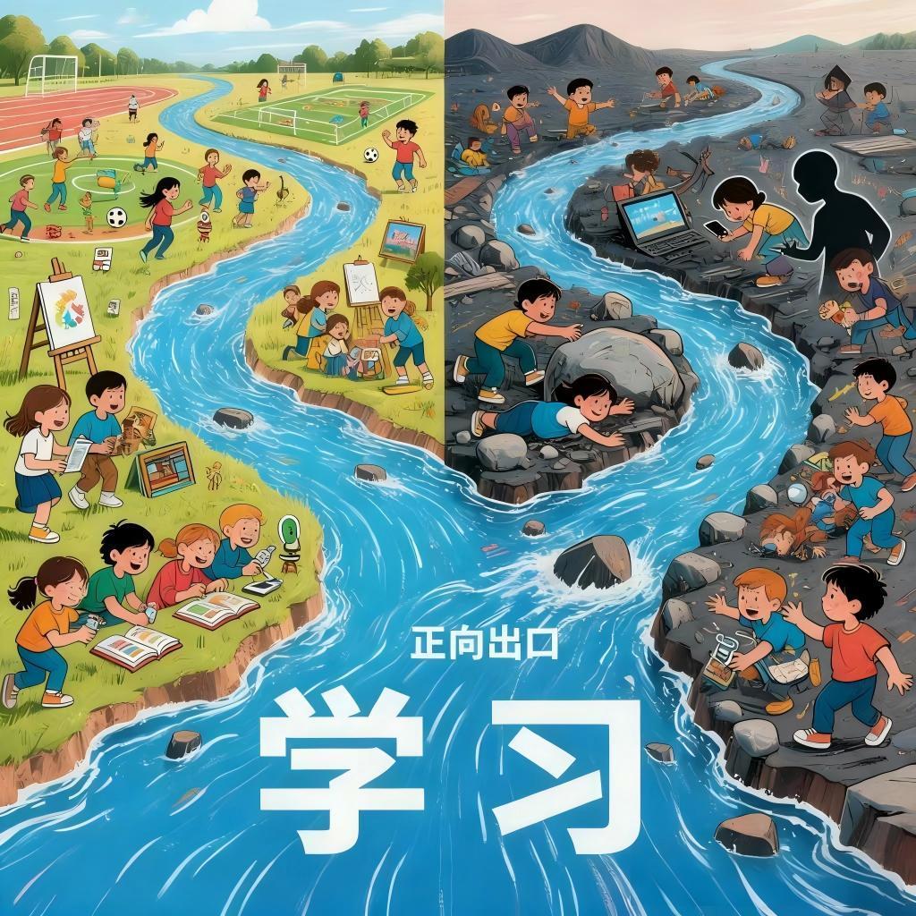 人的精力、注意力和内在动力就像一条河流。 对孩子来说,学习本应是这条河的主河道。 当主河道因为抗拒、困难、压力等被堵塞时, 河水不会消失,它一定会寻找其它出口。 ——正向出口:流向体育、艺术、社交活动、探索兴趣等等。 ——负向/问题出口:流向网络沉迷、打架斗殴、无意义瞎闹、与成人对抗等等。 孩子“不想学”, 但生来具有的探索和活动需求并未消失, 所以能量必然转移!