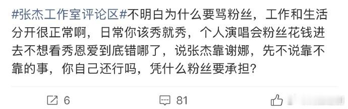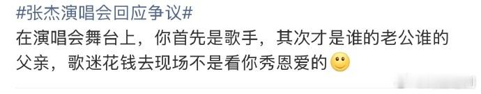 张杰昨晚回应粉丝“先是丈夫,再是歌手,特意维护谢娜”引发热议,唯粉反驳张杰昨晚言论,大家认同吗?“在演唱会上,首先是歌手,其次是丈夫,粉丝花钱不是看你秀恩爱”“你每天很多时间与谢娜在一起,粉丝只要求花几小时陪粉丝,很过分吗?”“想赚粉丝钱,又不听粉丝要求,粉丝的钱也不是大风吹来的。”