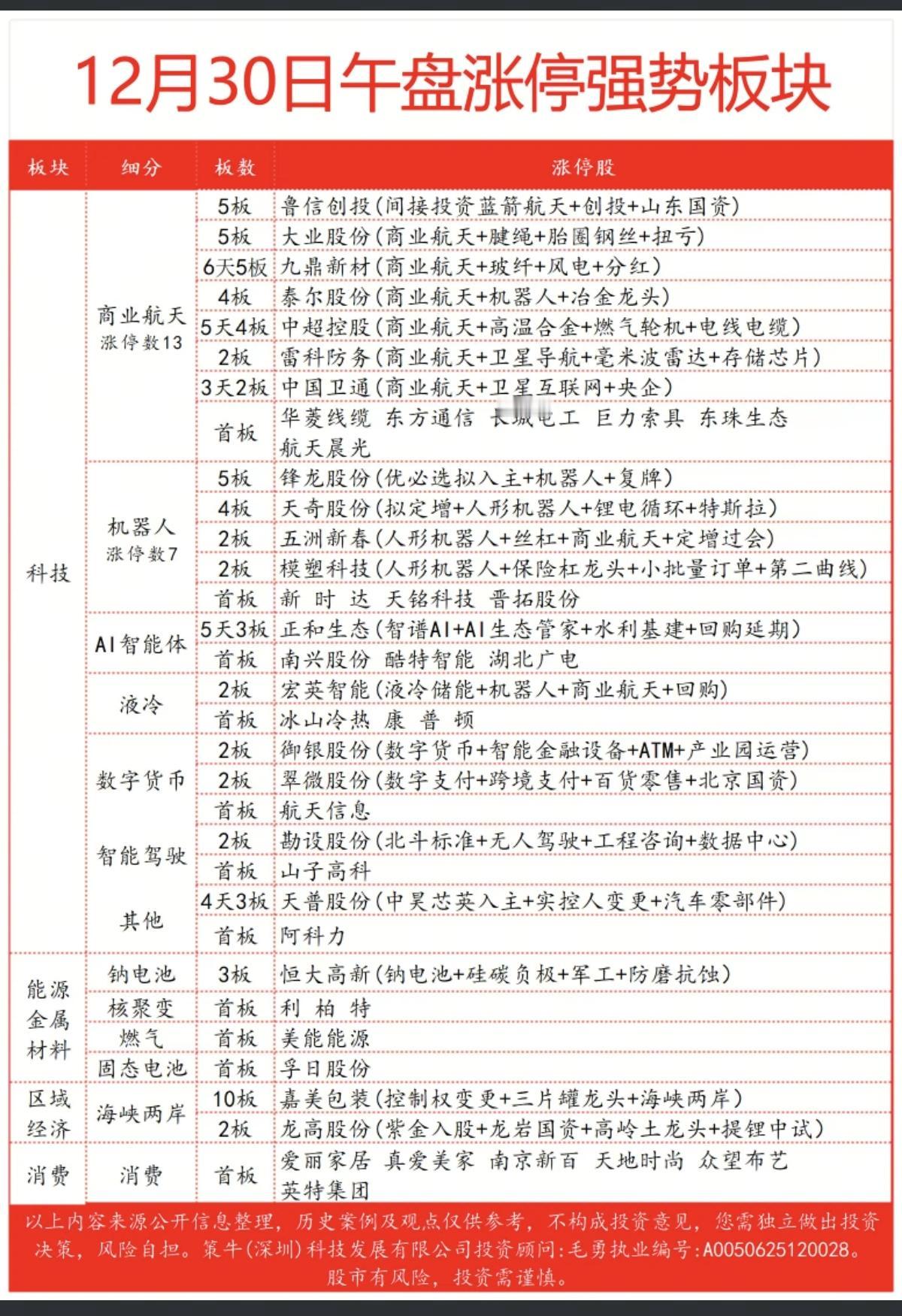 12.30周二 涨停板股票:题材+高度! 市场热点: 商业航天、机器人,智能体Ai ,数字货币,移动支付。无人驾驶,汽车零部件