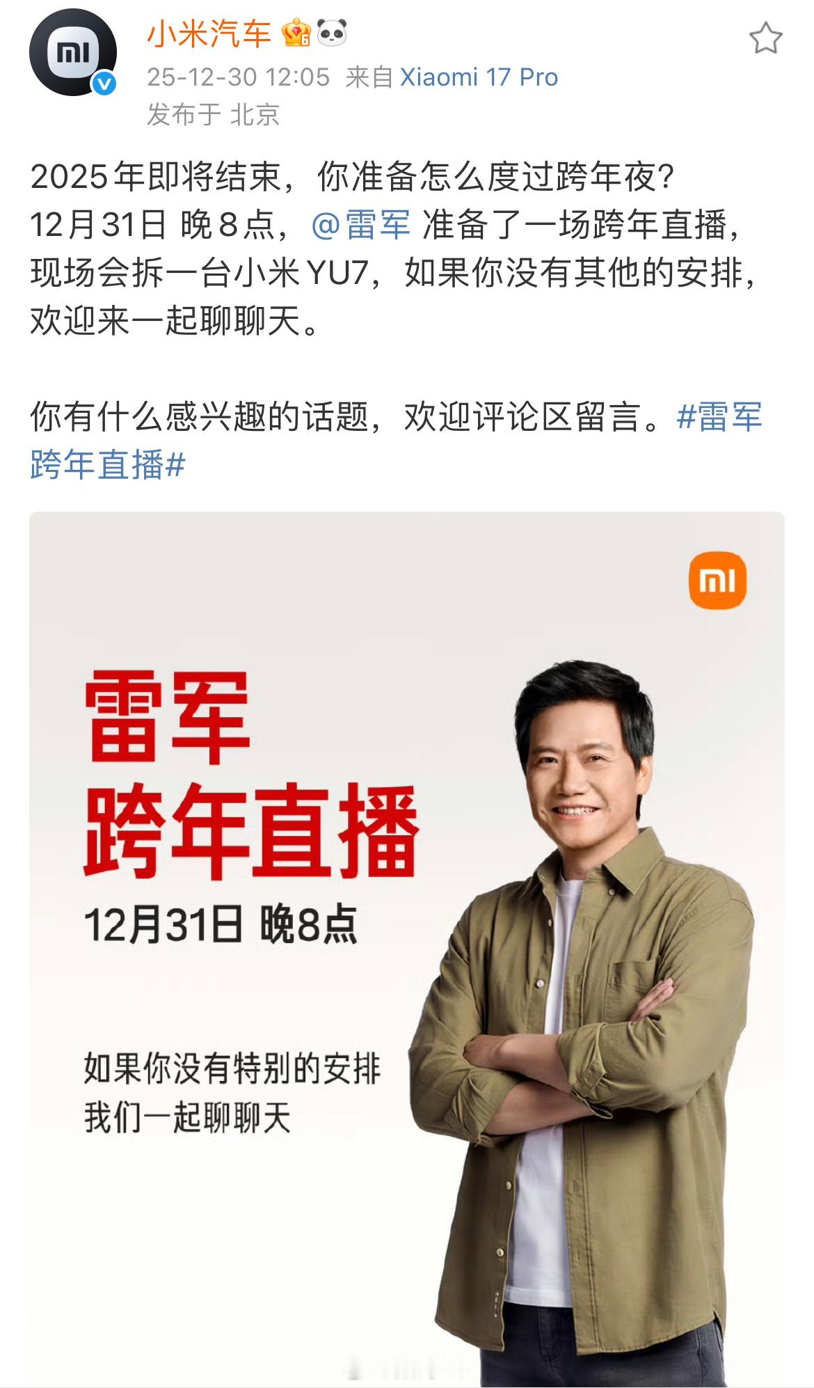 今年的雷总跨年来了,现场会拆一台小米YU7,依旧是那个雷总,强者恒强,不怕拆雷