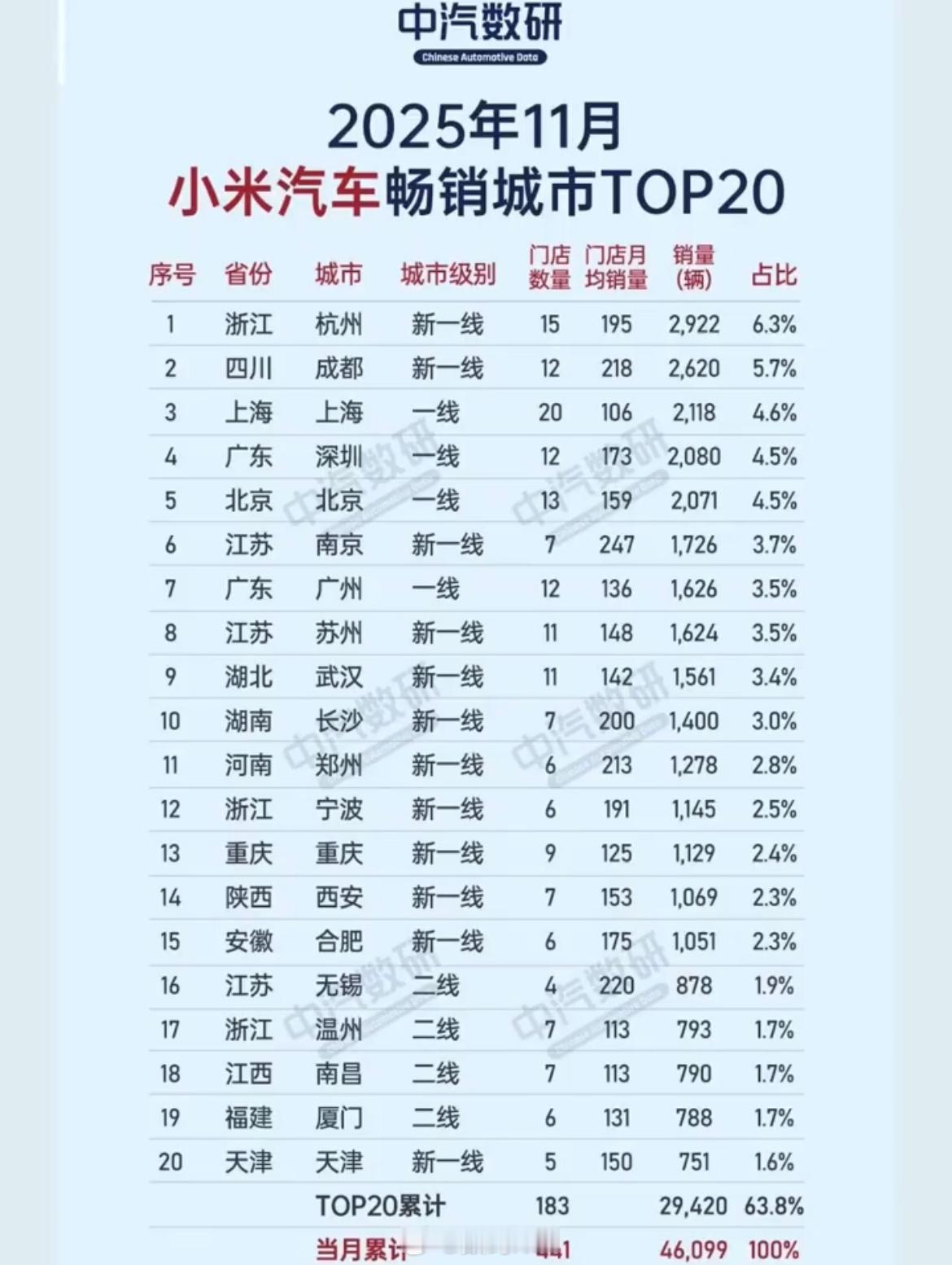 小米汽车11月份省份销量top20,前十的省份分别为1. 浙江:4860辆2. 江苏:4228辆3. 广东:3706辆4. 四川:2620辆5. 上海:2118辆6. 北京:2071辆7. 湖北:1561辆8. 湖南:1400辆9. 河南:1278辆10. 重庆:1219辆