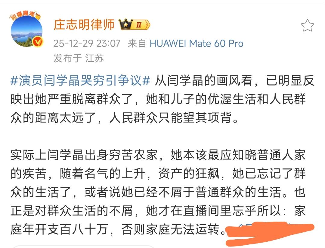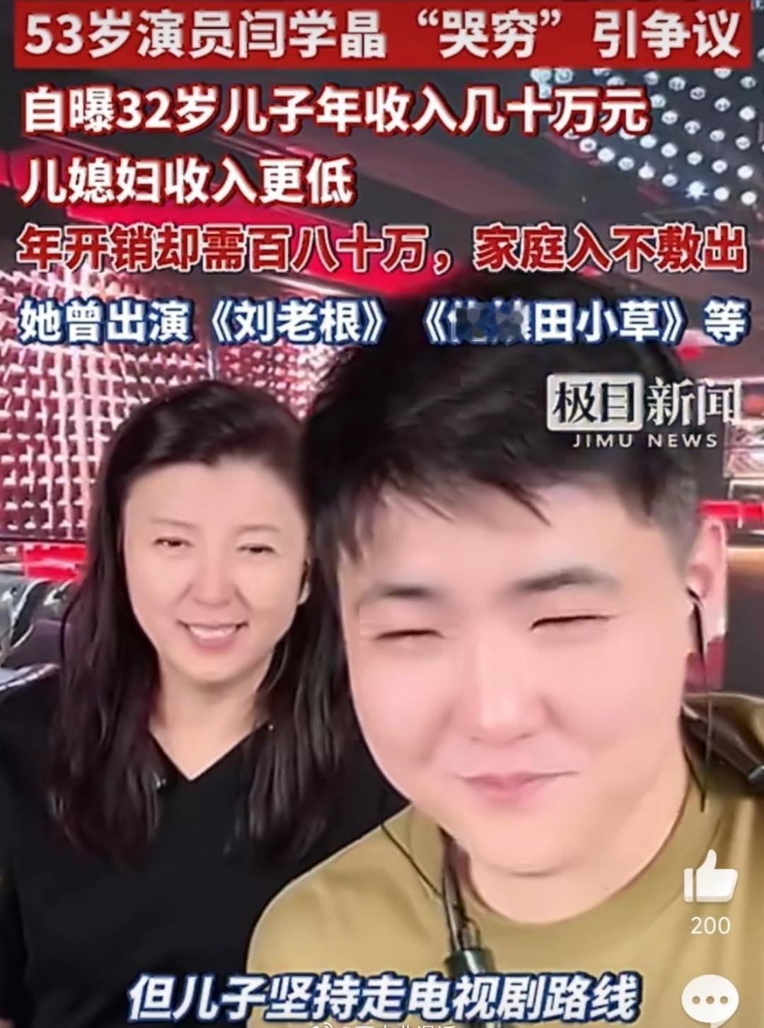 闫学晶直播哭穷这个事,其实也好理解。 闫学晶直播说儿子在北京几十万不够花,听着挺离谱,但你要是了解她的生活,可能就不这么想了。 演了一辈子农村剧,从《刘老根》里的山杏到各种底层女性角色,她把“接地气”刻进了骨子里。 可现实中,她的生活早就和普通家庭不是一个频道了。 在北京住着170多平的大平层,三亚还有房,看着风光,但物业费、装修维护这些钱,可不是小数目。 一条广告报价12万,直播带货收入更是没边,但北京的生活成本摆在那儿啊! 普通家庭一年20多万就够了,她儿子一年几十万,在北京也就刚够温饱,还得养孩子、教育、医疗,哪哪都要钱。 吃的有好的,用的有好的,干活还不能太累,赚钱还不能太少。 想维持这样的条件,一年可不得千八百万的。 我记得看过一个报道,有钱人家里光电费一个月都好几万。 甚至有些国外明星家里水龙头都不关。 就这么过日子,你不花钱谁花钱呢?