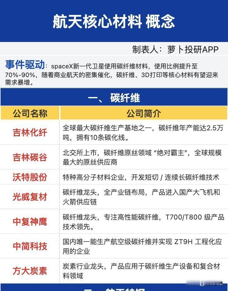 你以为火箭还靠钢铁硬撑? 错了,现在它身上裹的是碳布。 最新行业报告砸出一个数字:2025年,航天级碳纤维市场要冲到25亿美元,每年疯涨15%。 SpaceX、蓝色起源这些公司正把碳纤维用量推到90%——它们要的就是轻,要的就是省。 碳纤维直接替换箭体钢板。 卫星支架用它,重量砍半,发射成本骤降。3D打印同步突破,复杂构件一体成型,制造周期压短70%。 特钢在发动机里守稳极端高温。 碳纤维主外,特钢主内,材料搭档让商业航天甩掉包袱。 你的手机芯片、天气预报,背后都是这场材料革命在提速。 旧神话由国家书写,新星辰由材料点燃。
