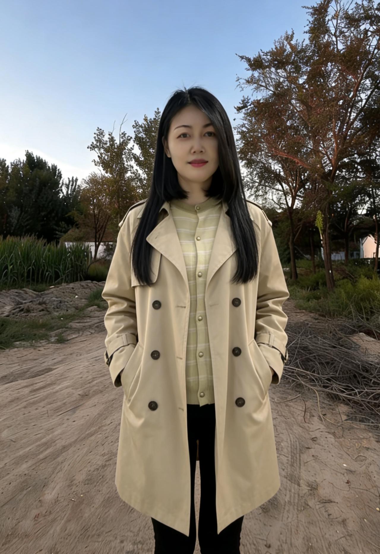 浅杏风衣罩薄霜,秋郊独立意清扬。 一双笑眼含秋水,胜却东篱菊蕊黄。