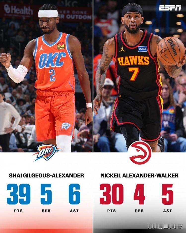 NBA新一代“麦迪和卡特”,亚历山大和表弟沃克对决均爆砍30+得分! 在今天雷霆与老鹰的比赛中,亚历山大和老鹰队的沃克迎来了“表兄弟对决”:表哥亚历山大全场24投15中爆砍39分5篮板6助攻2抢断的全能数据,表弟沃克也不差,全场投篮24投11中爆砍30分4篮板5助攻2抢断1盖帽的数据,两表兄弟成为了球场上的主角。 亚历山大和沃克的对决让球迷想起了曾经麦迪与卡特这对表兄弟,亚历山大众所周知已经是联盟第一巨星了,但是沃克也不差,本赛季在老鹰场均可以拿到20.6分3.4篮板3.2助攻的数据,虽然不如表哥耀眼,但是上赛季场均可是只有9.4分,进步可以说相当巨大了,未来也有机会成为全明星。