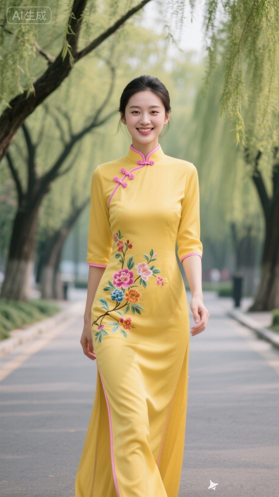 优雅旗袍漫步绿荫道,感受春日暖阳。🌸💛