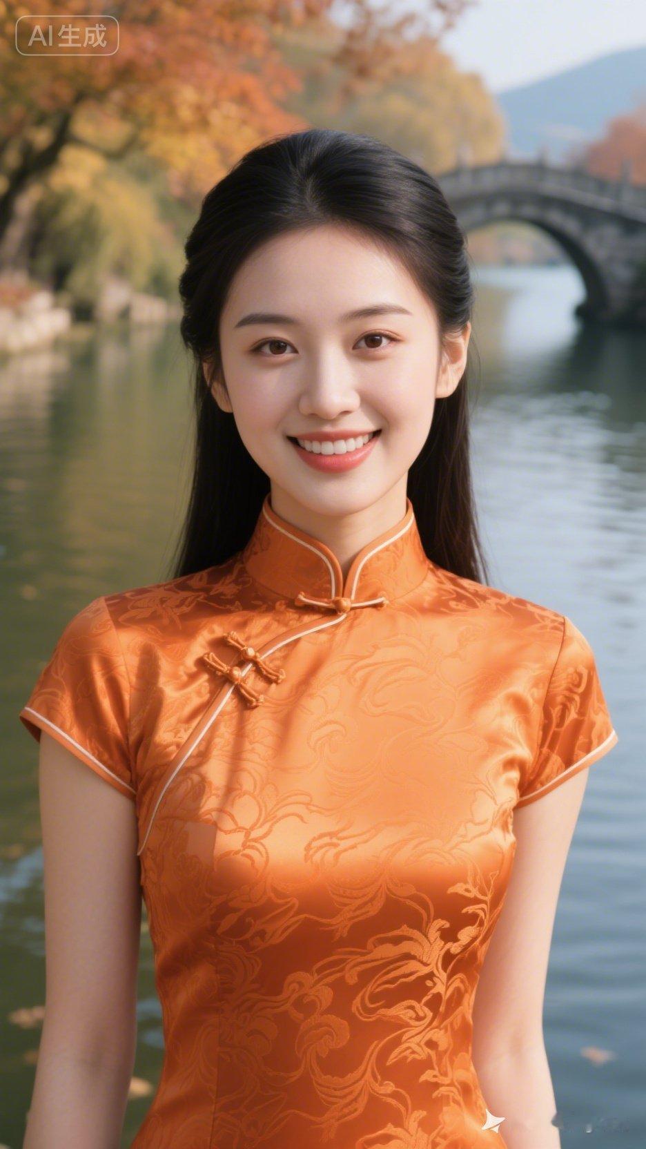 秋日游园,橙衣少女与古桥相伴,笑靥如花。
