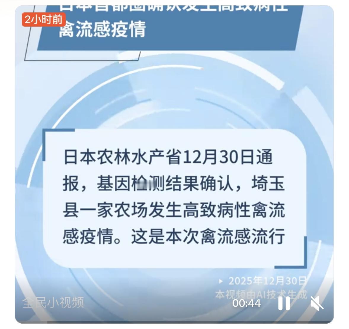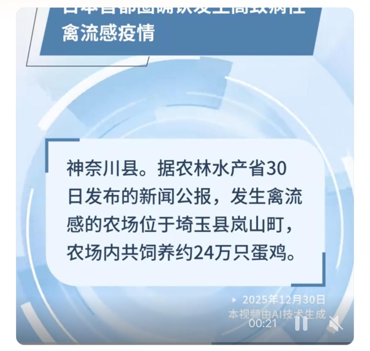 12月30日,日本埼玉县岚山町一处蛋鸡农场确诊发生H5亚型高致病性禽流感疫情,涉疫鸡只约24万只。这是日本本流行季报告的第12起禽流感疫情,也是首都圈(东京都、埼玉县、千叶县、神奈川县)本轮疫情中首例确诊病例。
