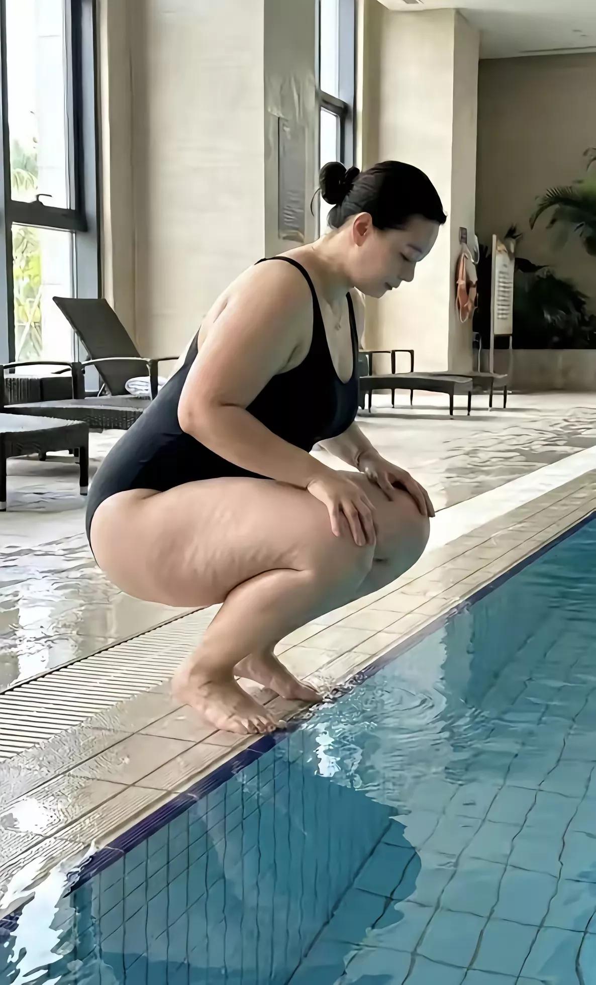 好想悄悄走到她身后,轻轻推她一把啊!没有坏心思,就是有点强迫症,觉得既然已经穿成这样了就不应该再待在岸上,白白浪费了好身材。大家说是不是呢?想象着她落入水中溅起水花的样子,然后在水里欢快地游动,说不定还会回头冲我嗔怪地笑一下。嘿嘿,那场景想想都觉得特带劲!