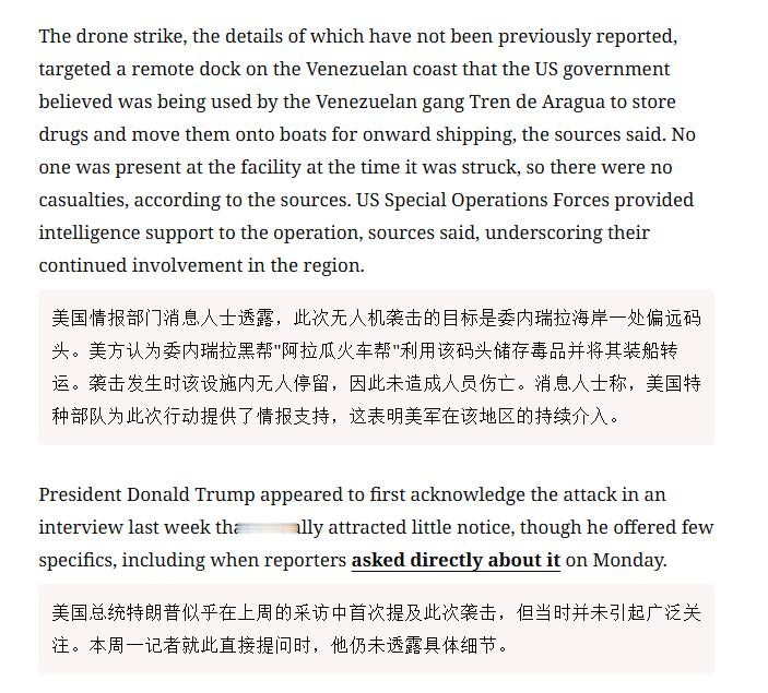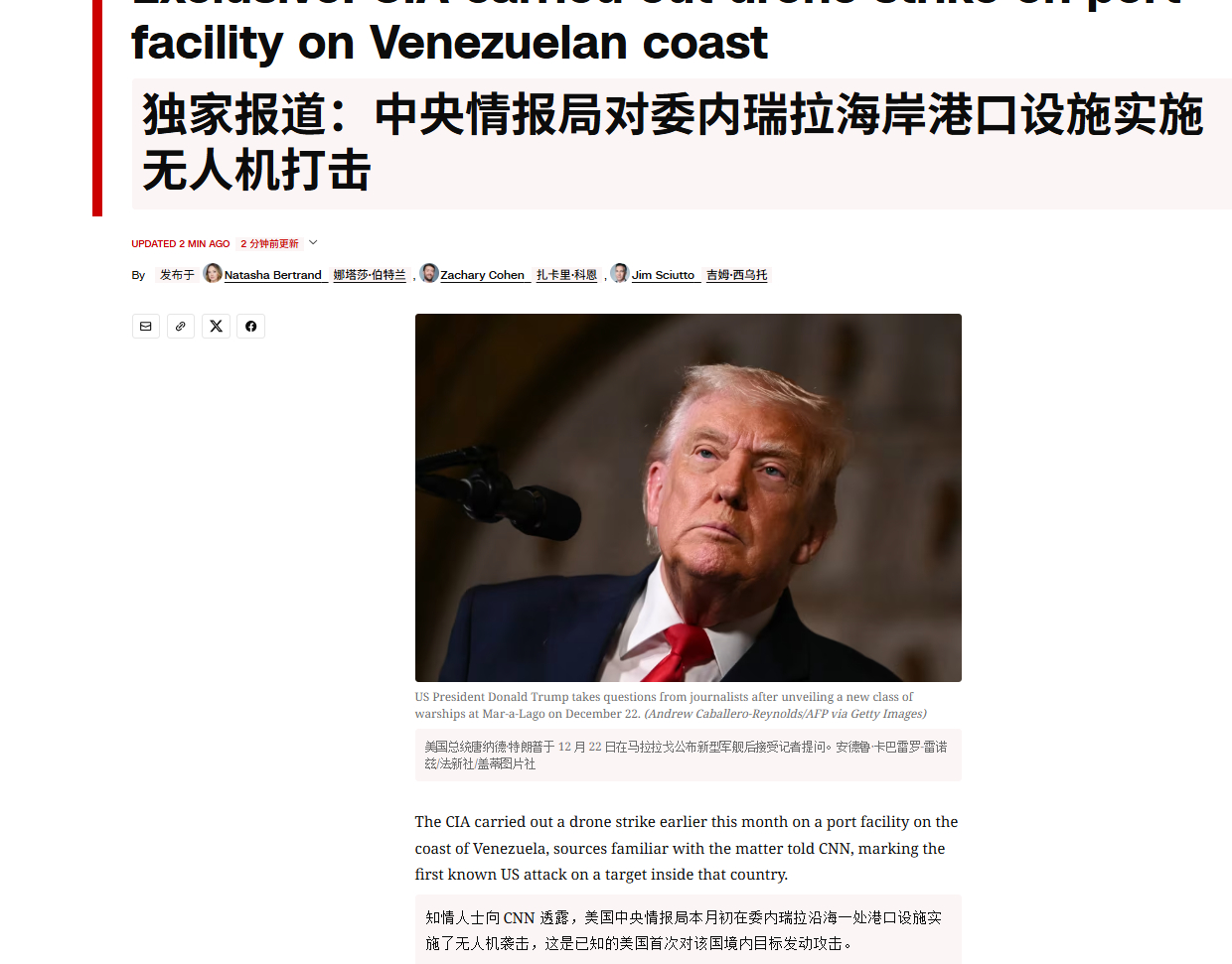 🔻CNN:据消息人士透露,美国中央情报局本月早些时候对委内瑞拉沿岸一处港口设施实施了无人机袭击。🔻这是美国首次对委内瑞拉境内目标发动已知袭击。🔻特朗普昨天宣布的“对委内瑞拉发起陆地打击”似乎是指这次袭击行动。热点现场海外新鲜事