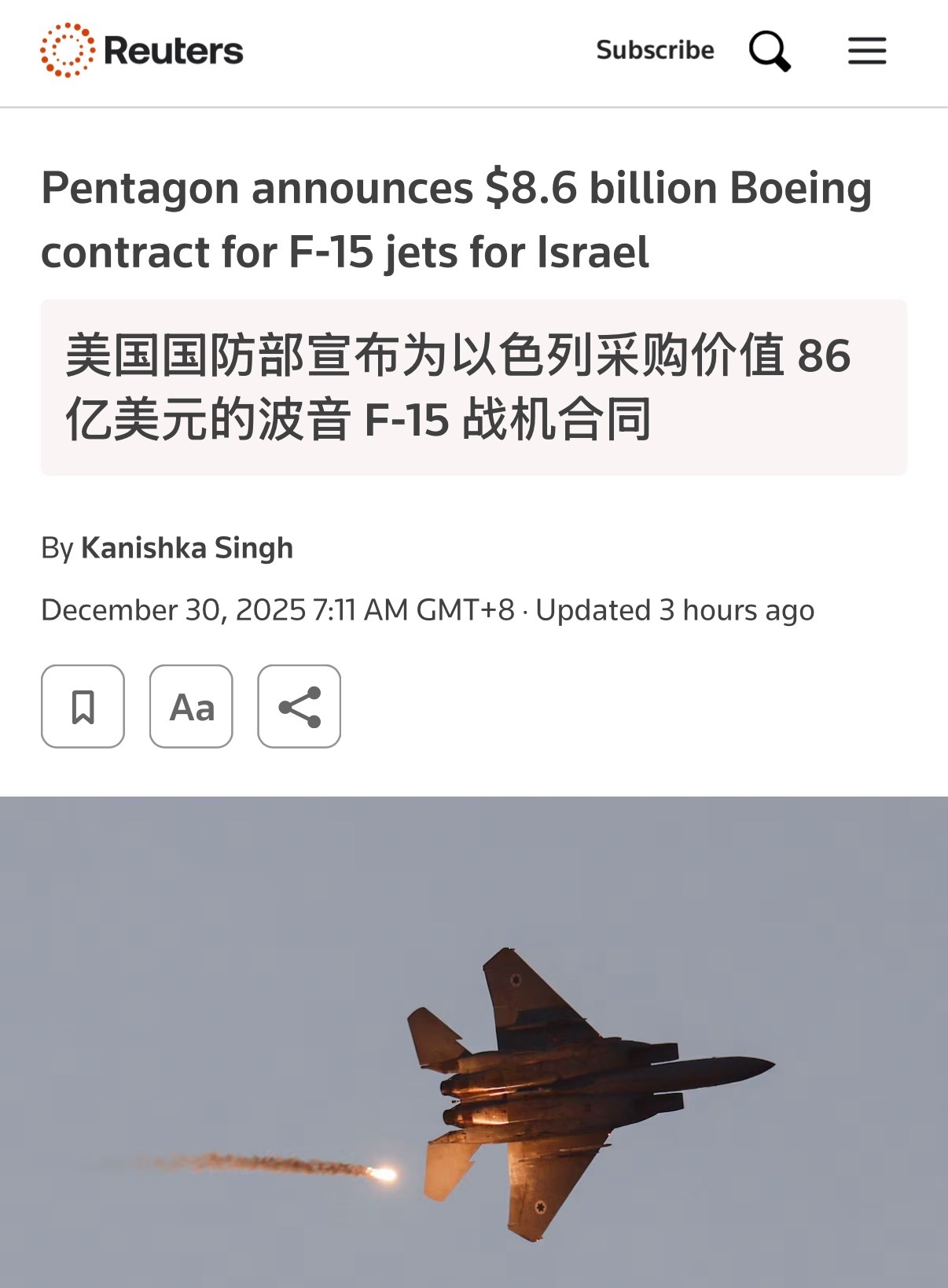 🔻五角大楼宣布:波音公司获得了一份价值近 86 亿美元的合同,用于生产 25 架 F-15IA 战斗机。🔻这些飞机将交付给以色列。🔻via 路透社热点现场海外新鲜事